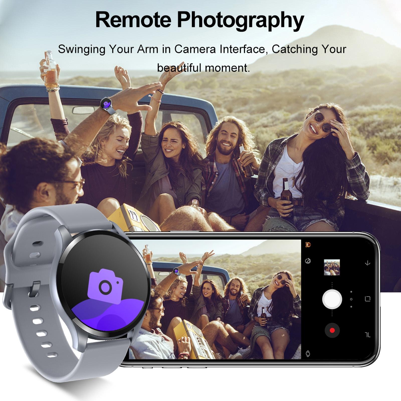 • Functions include pedometer, calorie tracker, sleep monitor, alarm clock, multi-sports mode, sedentary reminder, call and SMS notifications, remote camera, heart rate monitor, blood oxygen monitor, and body temperature monitor