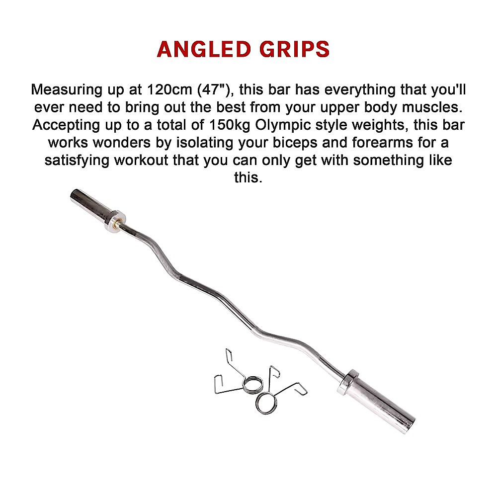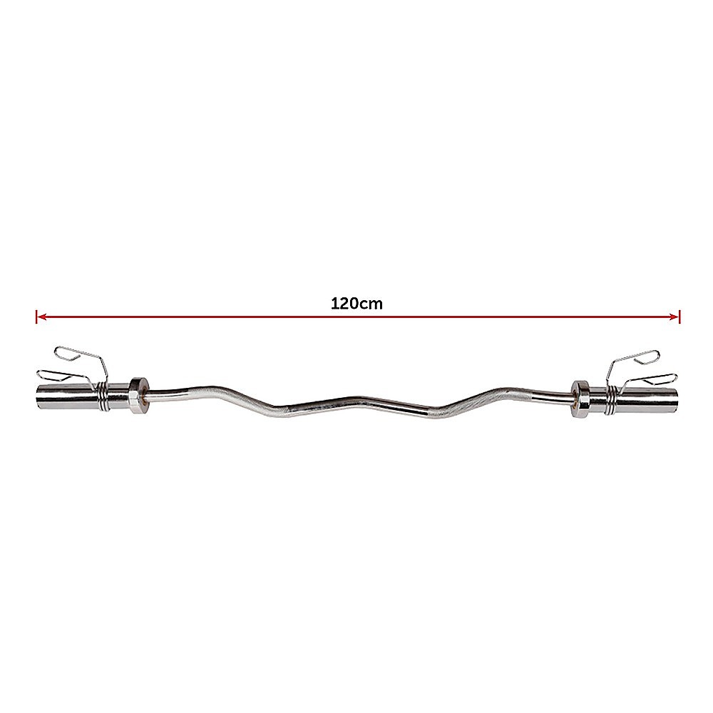 This chrome curl bar is 120cm (47) in length and accepts Olympic-style weights (not included) up to a total of 150kg. With your proper form, the design of this bar isolates the biceps as well as the forearms for an intense upper arm workout. It's a solid piece of hardware that weighs 8.2kg (18 lbs).