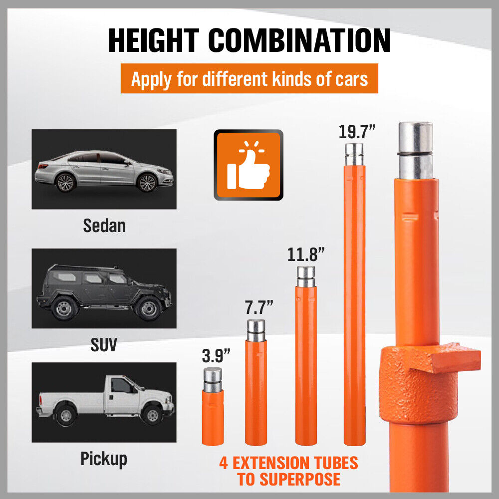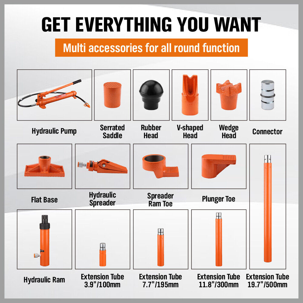 Perfect for All Your Needs: The portable hydraulic ram kit includes everything you need to complete your repair work! Hydraulic pump, hydraulic ram, 4pcs extension tubes, serrated saddle, rubber head, V-shaped head, wedge head, connector, flat base, hydraulic spreader, spreader ram toe, plunger toe. You will be ready to take on any project without breaking a sweat.