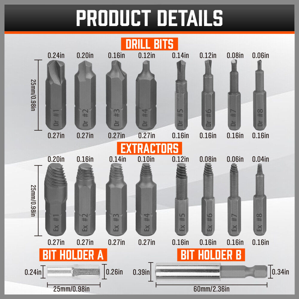 18x Magnetic Damaged Screw Extractor Set Broken Drill Bit Remover Kit Hex Crv