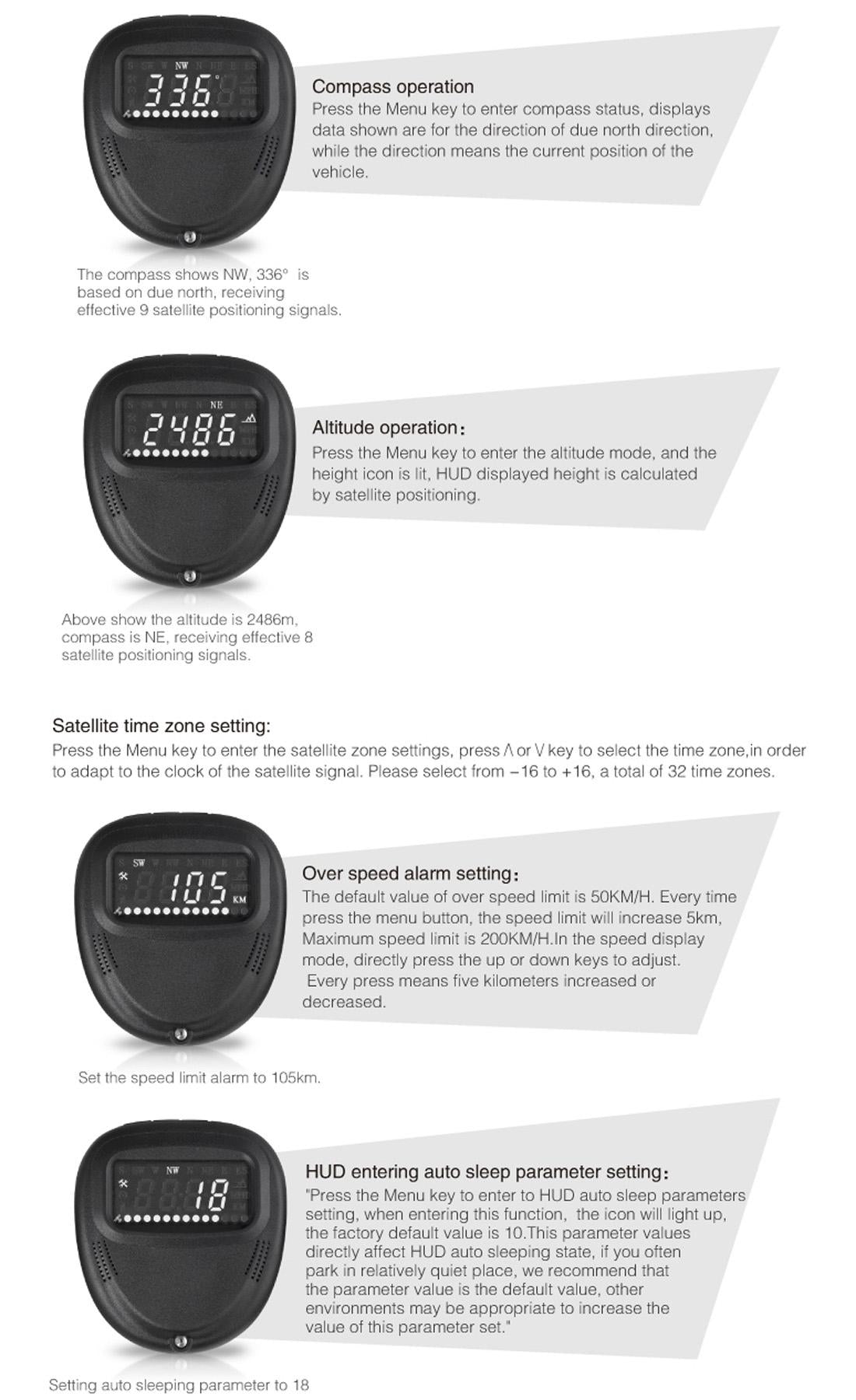 • Displays vehicle speed, real-time information, over-speed alarm, compass, altitude, and has an auto-sleeping mode.