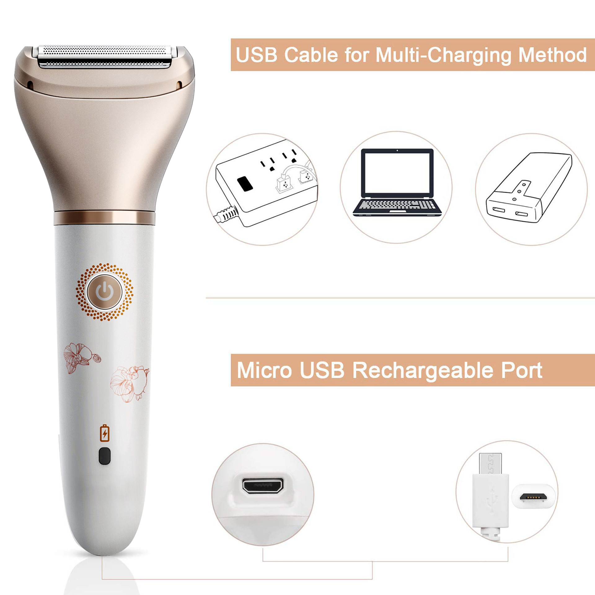 Featuring a lithium battery with USB charging, this device is 100% washable, allowing for easy cleaning and use in wet or dry conditions. The dual-head design ensures efficient hair removal, with the shaver head perfect for larger areas like legs and arms, and the epilator head ideal for facial hair and smaller areas. The elegant rose gold and white finish adds a touch of luxury to your grooming routine.