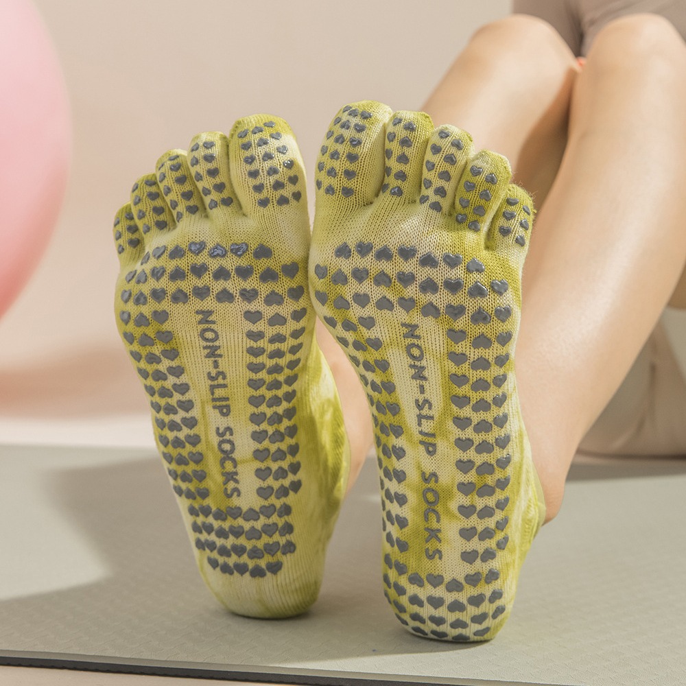 2 Pairs Green Tie-Dye Non-Slip Yoga Socks for Women – Five-Toe Cotton Blend Socks for Pilates and Indoor Sports