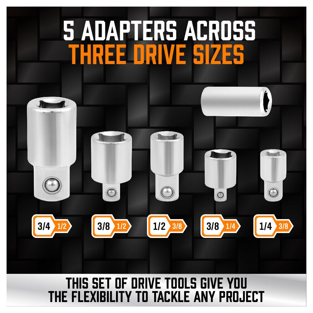 5x Reducer adaptor: 1/4″ to 3/8″,3/8″to1/4″, 1/2″ to3/8″,3/8″to1/2″, 3/4″ to1/2″.