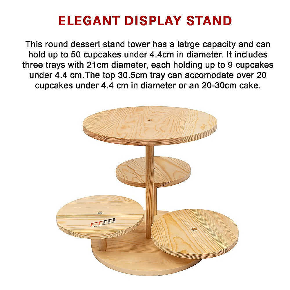 This round dessert stand tower has a latrge capacity and can hold up to 50 cupcakes under 4.4cm in diameter. It includes three trays with 21cm diameter, each holding up to 9 cupcakes under 4.4 cm.The top 30.5cm tray can accomodate over 20 cupcakes under 4.4 cm in diameter or an 20-30cm cake.
