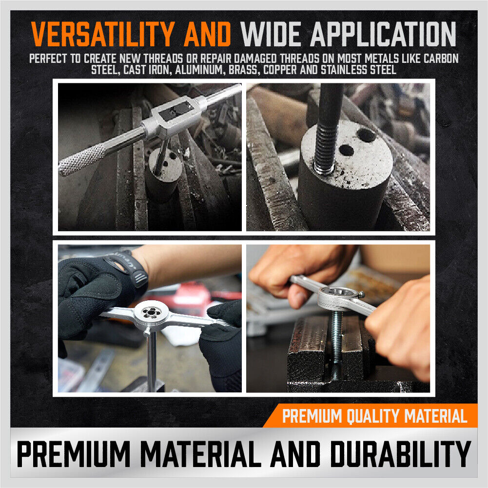20x SAE Fractional taps and dies for coarse thread (UNC): 4-40 NC, 6-32 NC, 8-32 NC, 10-24 NC, 12- 24 NC, 1/4-20 NC, 5/16-18 NC, 3/8-16 NC, 7/16-14 NC, 1/2-13 NC