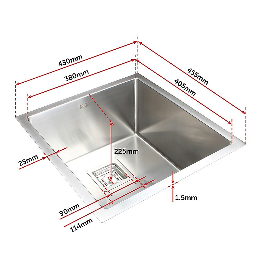 This single sink is made from 1.5mm-thick Type 304 stainless steel with a satin finish for a brilliant look that will last and last. It measures 430 x 455 x 255mm (L x W x D) with a 90mm drain opening. A Square Strainer waste is included. Installation is Undermount / Topmount-style.