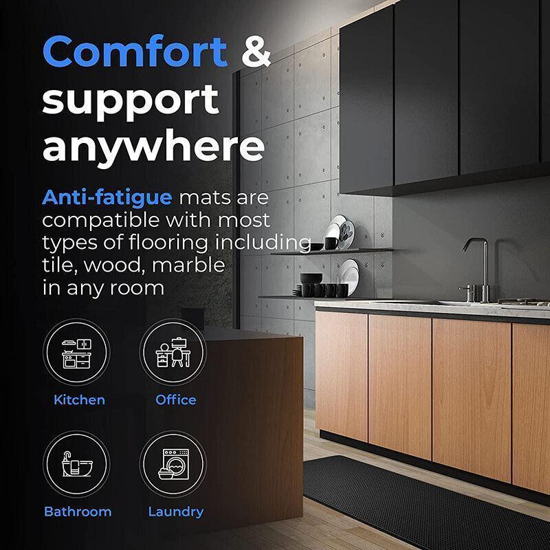 4 Size for choice. Whether you’re cooking, preparing food, or working at your standing desk, this mat can be an anti fatigue mat to provide comfort and help relieve pressure on your feet.