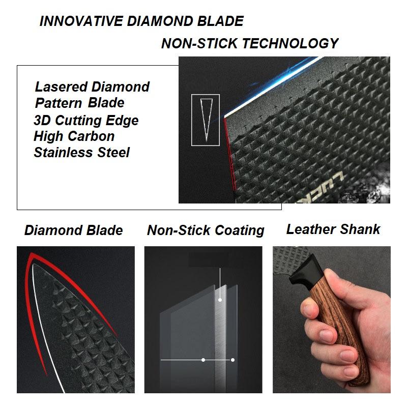 A specialized set of stainless steel nonstick knife sets for all your chopping needs. Includes Chef knife, Utility knife, Cleaver knife, fruit knife, Scissor ceramic peeler.