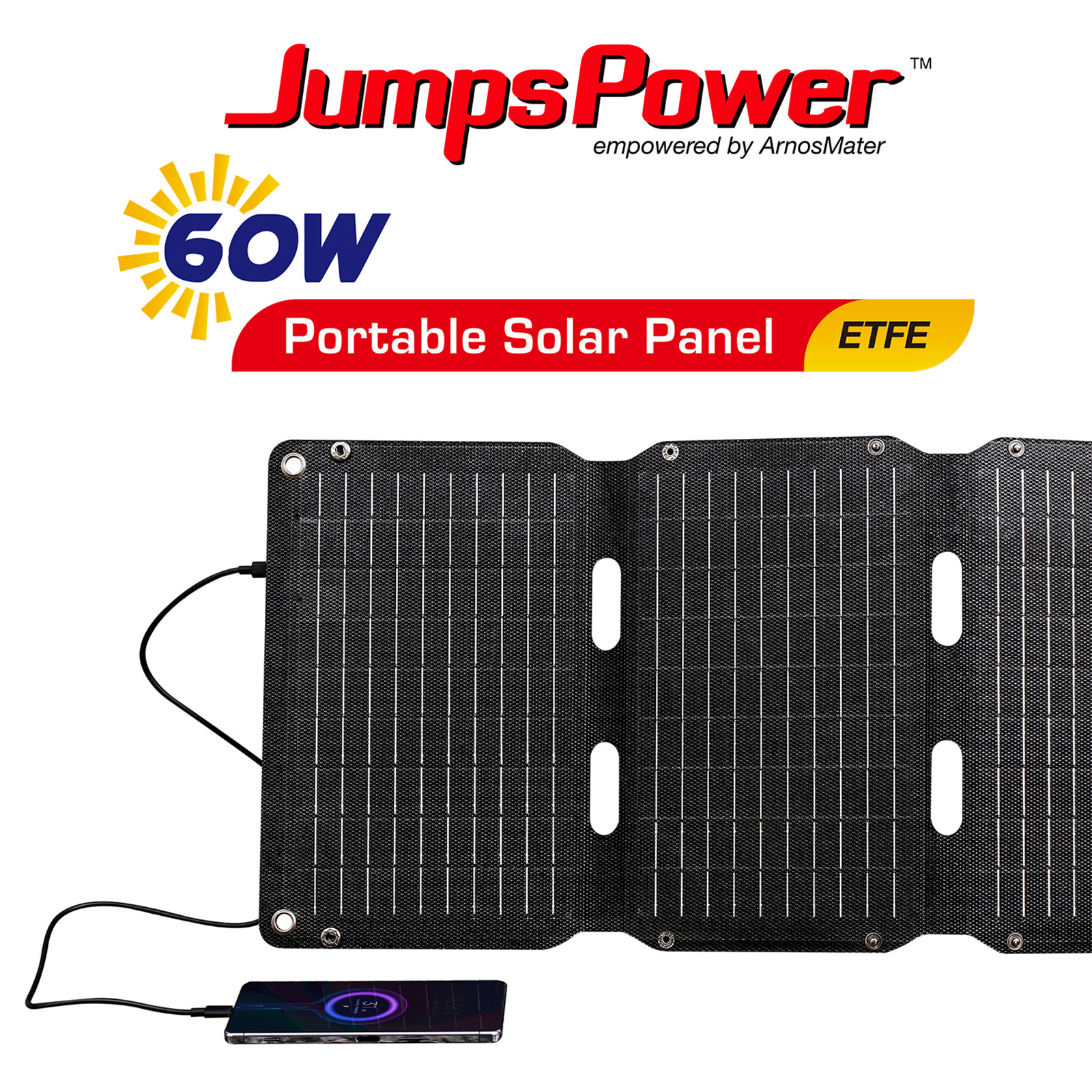 The JumpsPower 60W Portable Solar Panel is a cutting-edge solution for all your on-the-go energy needs. Utilizing high-efficiency monocrystalline silicon cells and coated with durable ETFE film, it delivers a superior performance by harnessing solar power more effectively. Designed for longevity and higher conversion efficiency, this panel is ideal for outdoor enthusiasts and professionals alike.