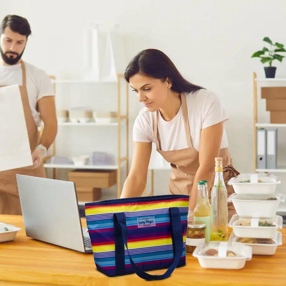 - KEEPS ICE FOR HOURS: Our kitchen reusable grocery bags can be used to help carry groceries or for food delivery – Thick Thermal Foam Insulation keeps groceries cold and food warm – the ideal carrier for picnics, potlucks and dinner parties. Perfect for frozen groceries, cold beverages, or hot takeout orders. Tested to keep ice frozen for 8+ hours when zipped.
