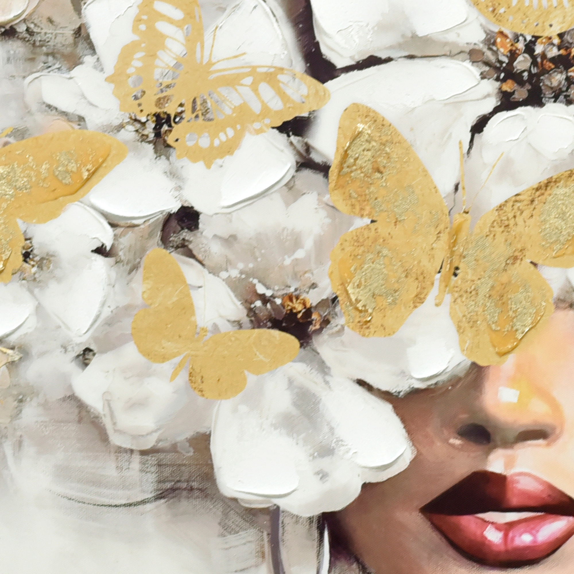 “Floral Fantasia” is a mesmerizing fusion of the human form and nature’s bounty. At its core lies the portrait of a woman, her features beautifully accentuated with striking lipstick and a chic black top adorned with white spots. But what truly captivates the viewer’s gaze is the cascade of white flowers that replaces her tresses, flowing in a dreamy abundance and covering the top half of the canvas, hiding her eyes. These blossoms are brought to life with the ethereal presence of gold butterflies, adding a touch of whimsy and wonder. Crafted with a harmonious blend of hand-painted details and print, the artwork is framed within dark fir wood, grounding its ethereal elements. “Floral Fantasia” isn’t merely a portrait; it’s an enchanting tale of beauty, mystery, and nature’s magic.