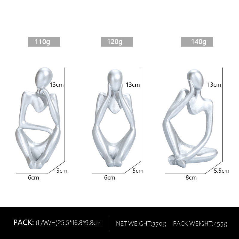 Abstract Thinker Sculpture Set – Elevate your home decor with this striking set of abstract thinker sculptures in a silver finish. Crafted from high-quality resin, these modern art figurines depict thought-provoking poses, perfect for adding a touch of sophistication to any room. Each piece measures 13cm (5.1in) in height, with individual weights of 110g, 120g, and 140g. Ideal for living rooms, offices, or study spaces, this set brings an artistic flair to your decor.