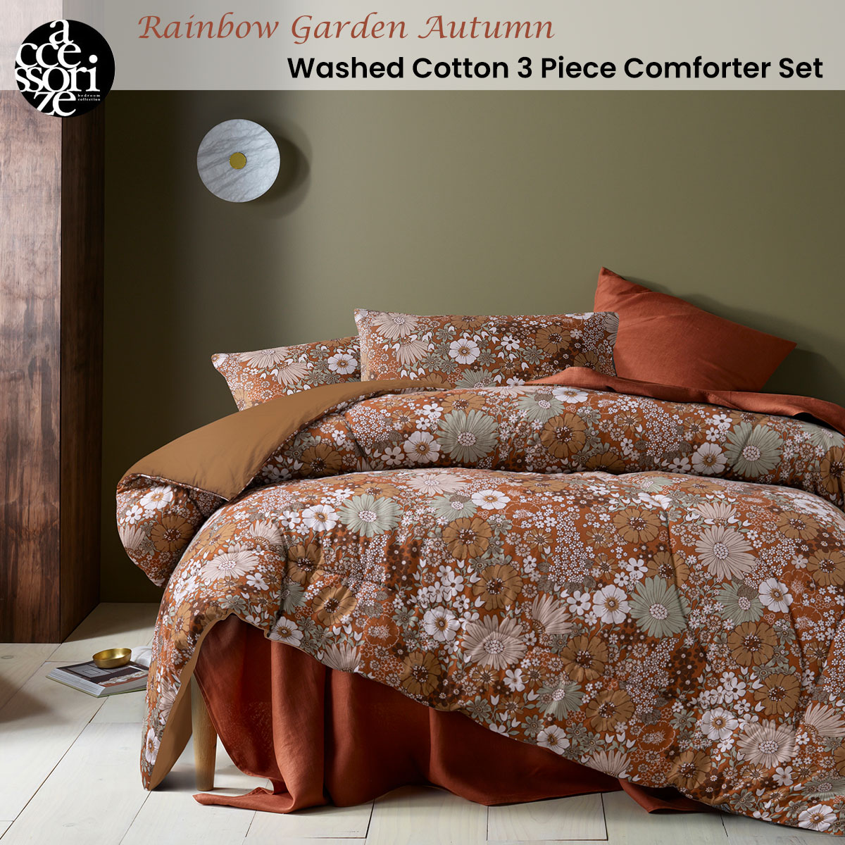 Accessorize 3 Pcs Rainbow Garden Autumn Washed Cotton Comforter Set Double
