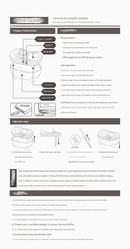 Warm Tips: When adding water, pull up the bottle lid, fill with an appropriate amount of water, then press down to seal. Avoid overfilling. If the spray volume is small after prolonged use, it may be due to mineral buildup; clean the spray nozzle. It is recommended to use tap water or mineral water. Do not use pure water or distilled water as it may cause water accumulation at the spray nozzle. Do not add oily or corrosive chemicals. Use a certified adapter to power the humidifier. When injecting and cleaning, disconnect the power and unplug the connector. Do not touch or damage the spray nozzle. Do not disassemble or modify the humidifier. If there is residual water in the cotton swab, it may damage the mainboard.