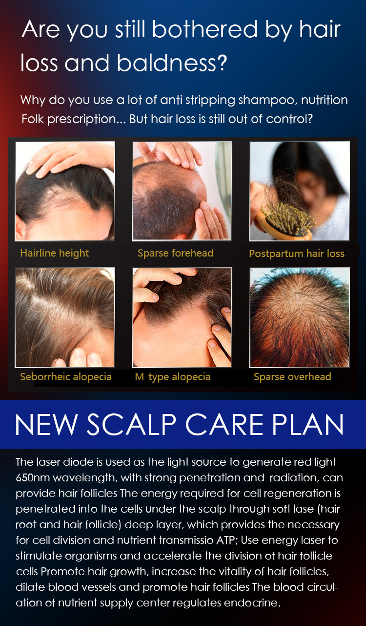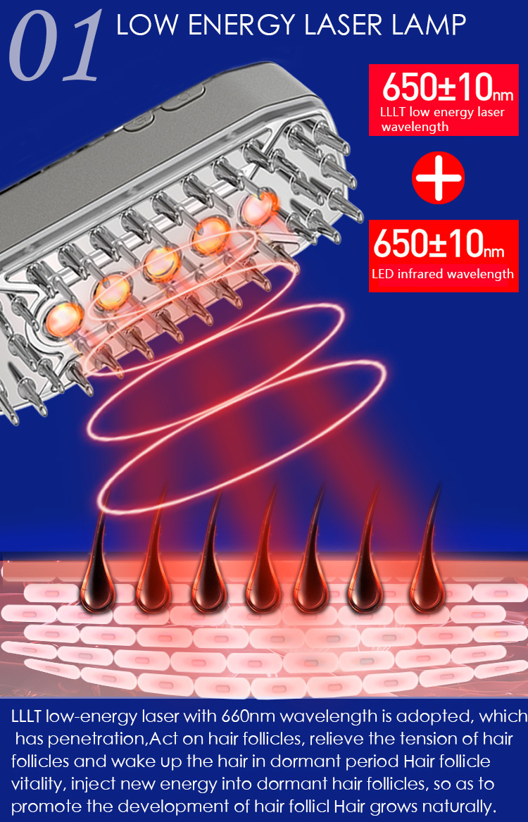 - Low-Energy Laser Lamp (LLLT + Red Light): Utilizes 650±10nm LLLT low-energy laser and 650±10nm LED infrared wavelength to penetrate the scalp, act on hair follicles, relieve tension, and promote the development of dormant hair follicles.