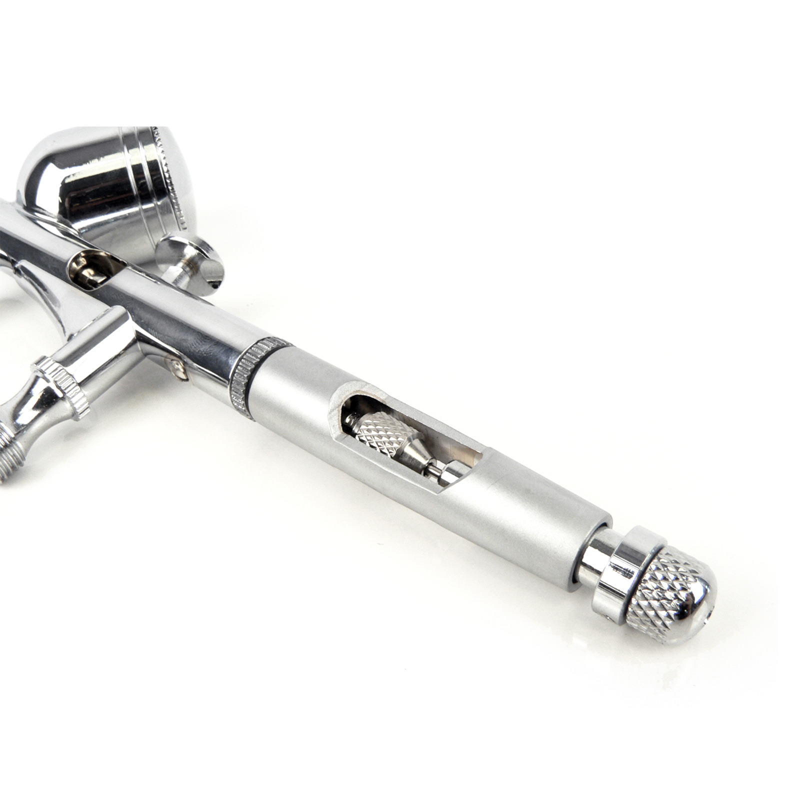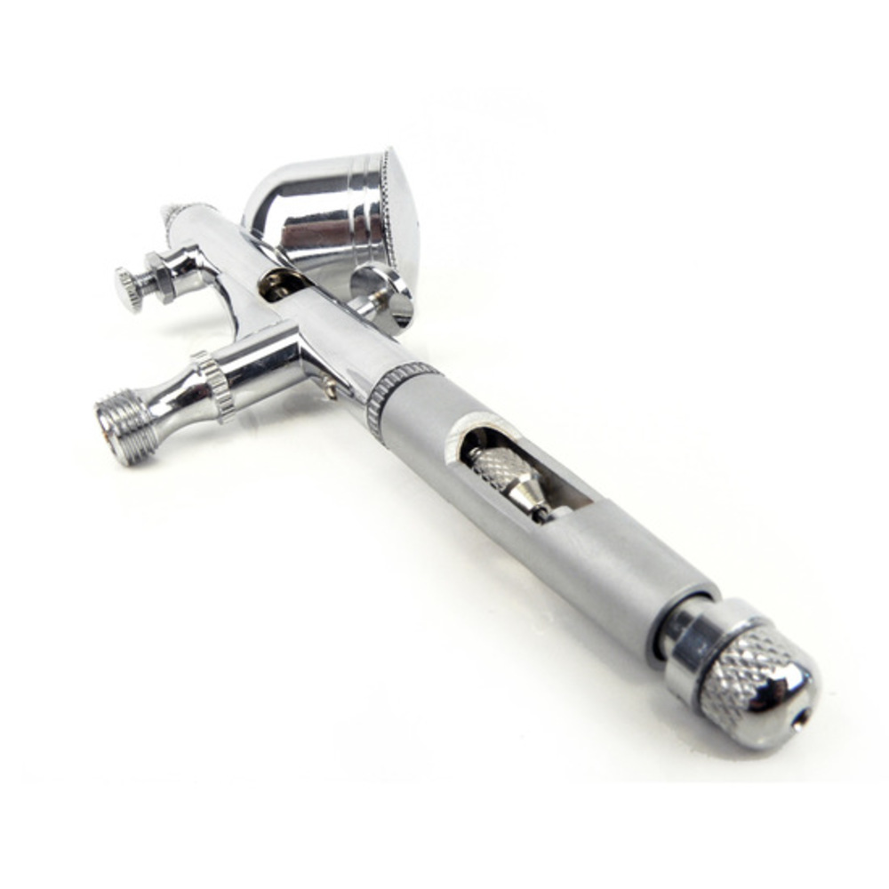 Dual Action Gravity feed airbrush designed for quick changes of custom mixed colours. The trigger controls both air and colour (down for air, back for colour). This allows the artist to change the width of the line, the range of value and the opacity of paint without stopping their hand motion. It is also feature Micro Air Control Valve can control the air flow at the head of air brush in order to maximize control of paint output. Air brushes with top-mounted colour cups in which gravity draws paint into the air brush. Less air pressure is required enabling slower hand movement which creates excellent control for fine detail applications. Perfect for general purpose art and craft projects as well as cosmetics, fingernail art, model railroad detailing, R/C car bodies, and automotive airbrushing.