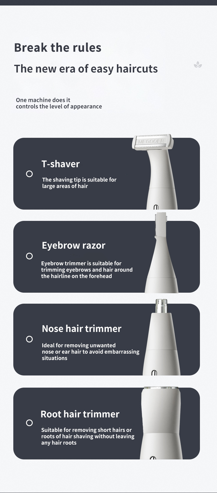- Root Hair Trimmer Head: Suitable for removing short hairs or tackling stubborn roots without leaving any residue, ensuring a smooth finish.