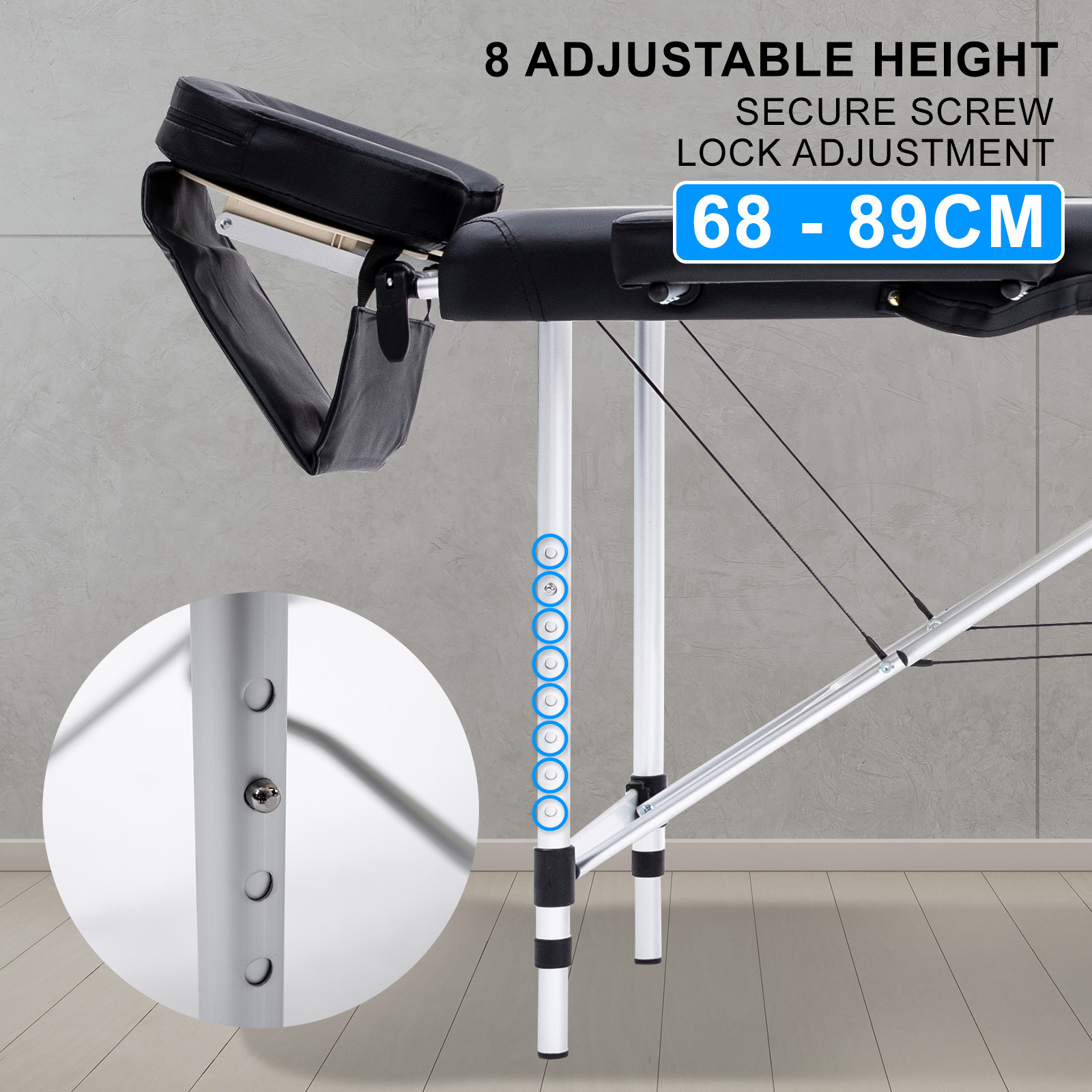 With an aluminium-made structure, it ensures that the table is light-weighted, allowing users to carry it to different places. However, this doesn’t sacrifice its safety as it is equipped and reinforced with a w-shaped pole that goes across both legs. It helps increase the stability of the table, preventing it from toppling over. Furthermore, this latest design is harnessed with a Quick-Lock system, reducing hassles in opening and folding up the table. The legs are also equipped with 8 adjustable heights, to suit masseuses and beauty therapists of different heights, making sure they are working comfortably and providing their best service.