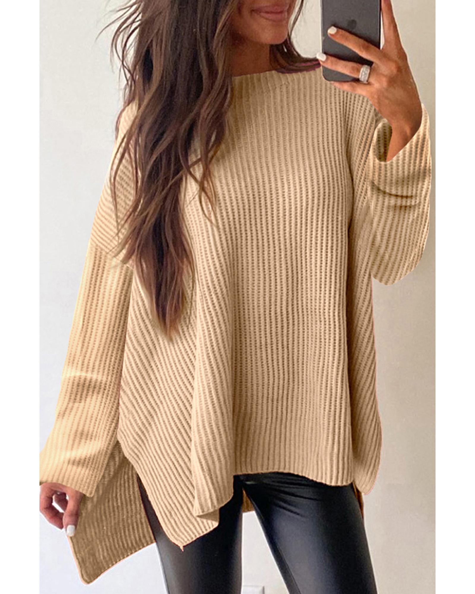 Apricot Cable Knit Drop Shoulder Side Slits Loose Sweater – L