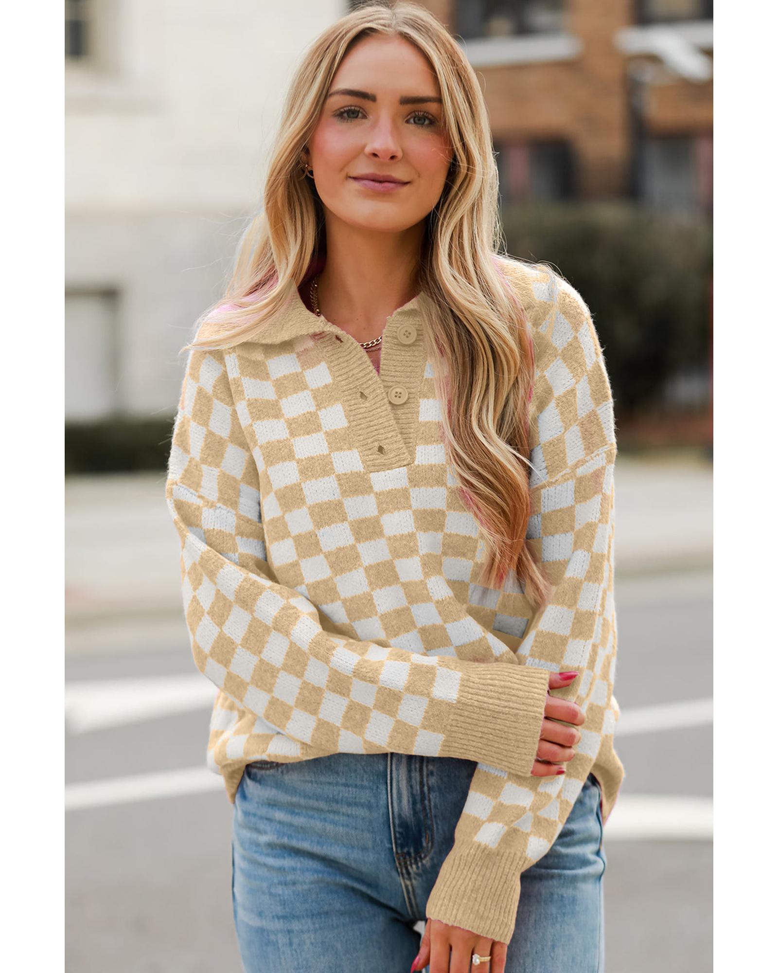 Apricot Checkered Buttons Collar V Neck Drop Shoulder Sweater – M