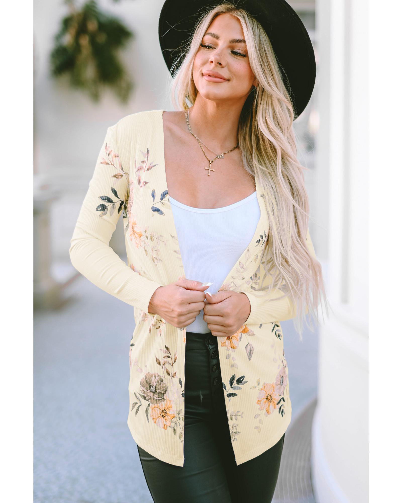 Apricot Floral Print Ribbed Knit Slim Fit Cardigan – L