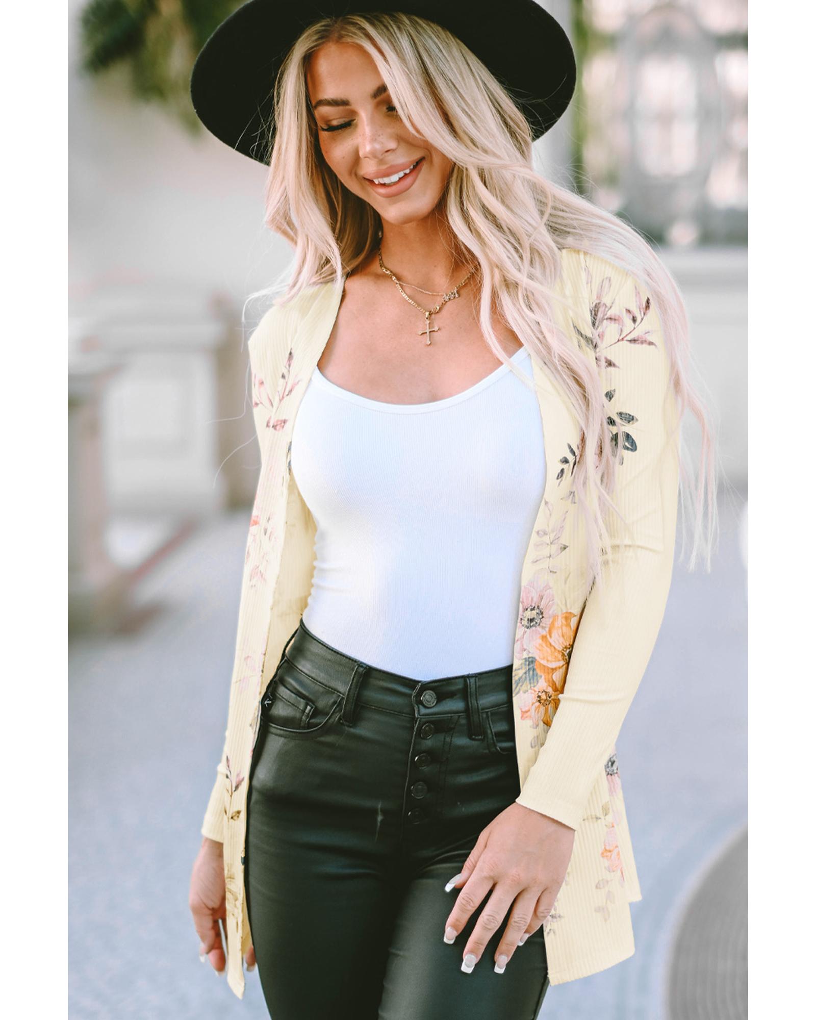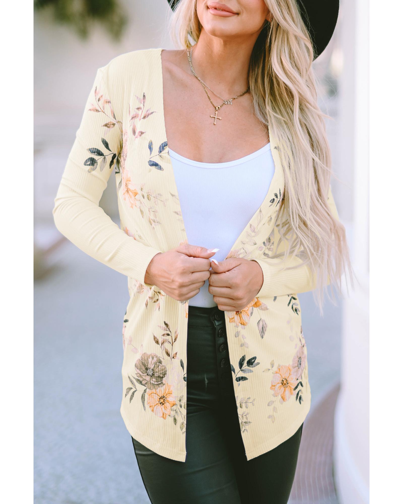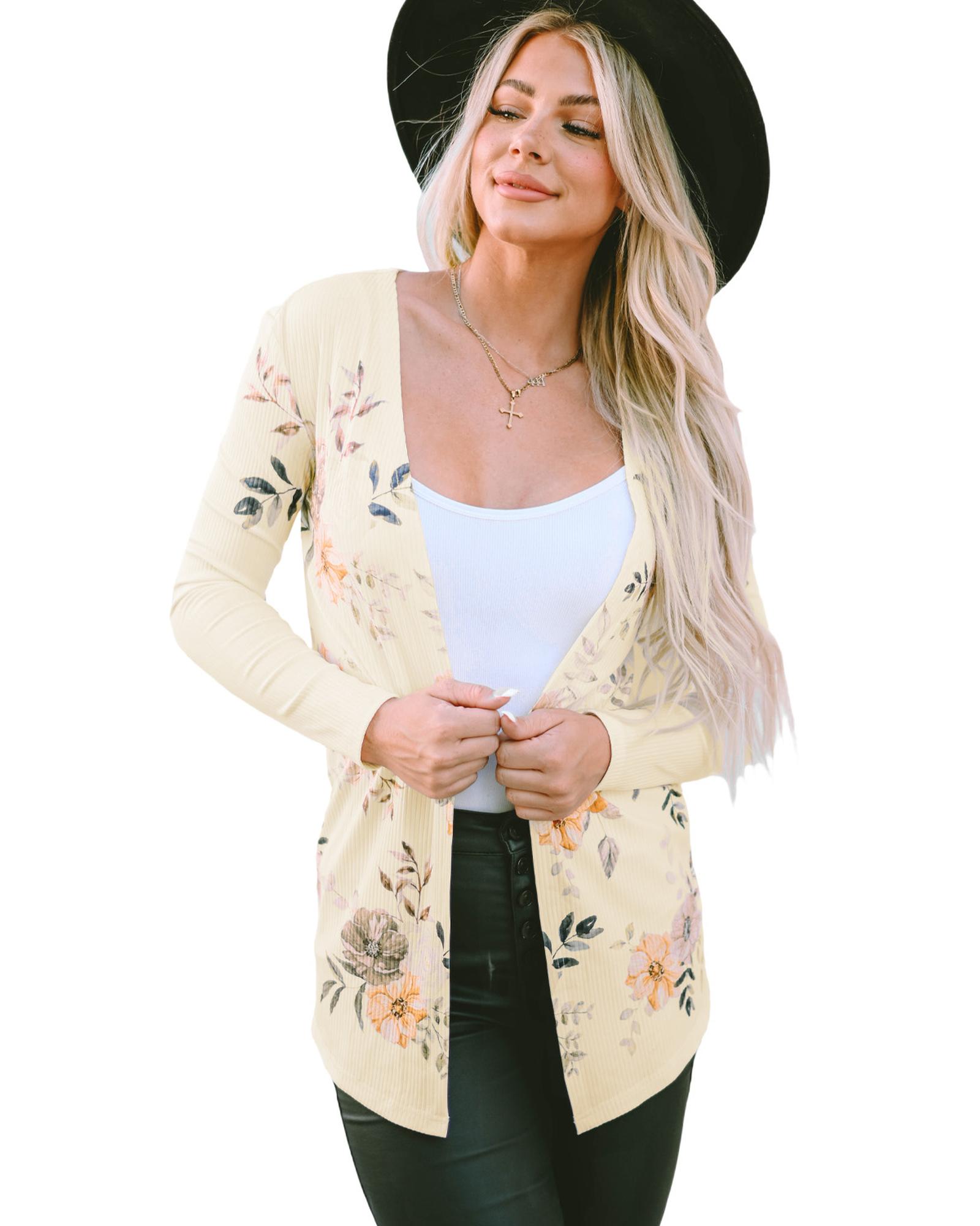 Apricot Floral Print Ribbed Knit Slim Fit Cardigan – M
