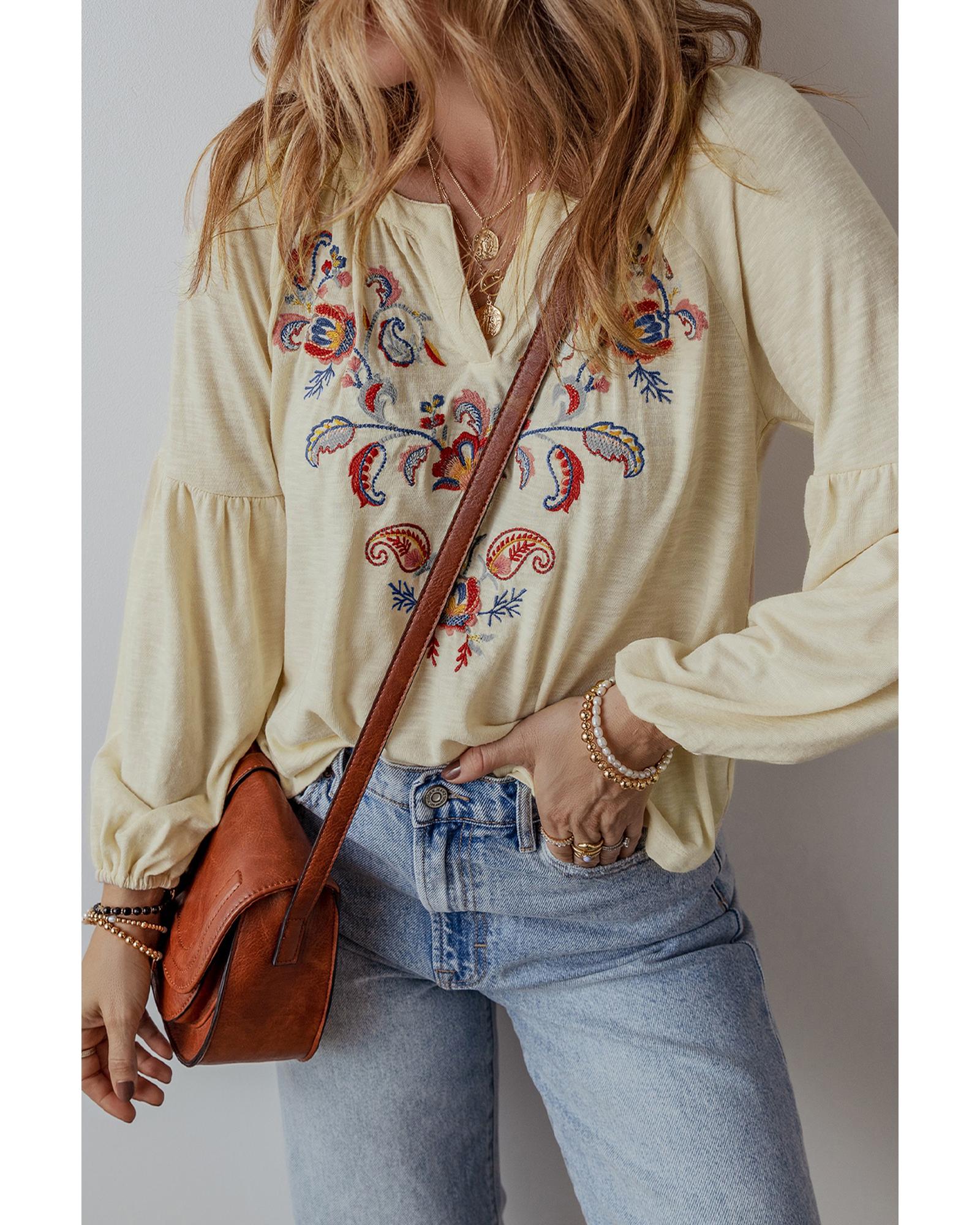 Apricot Paisley Floral Embroidered Notch V Neck Blouse – S