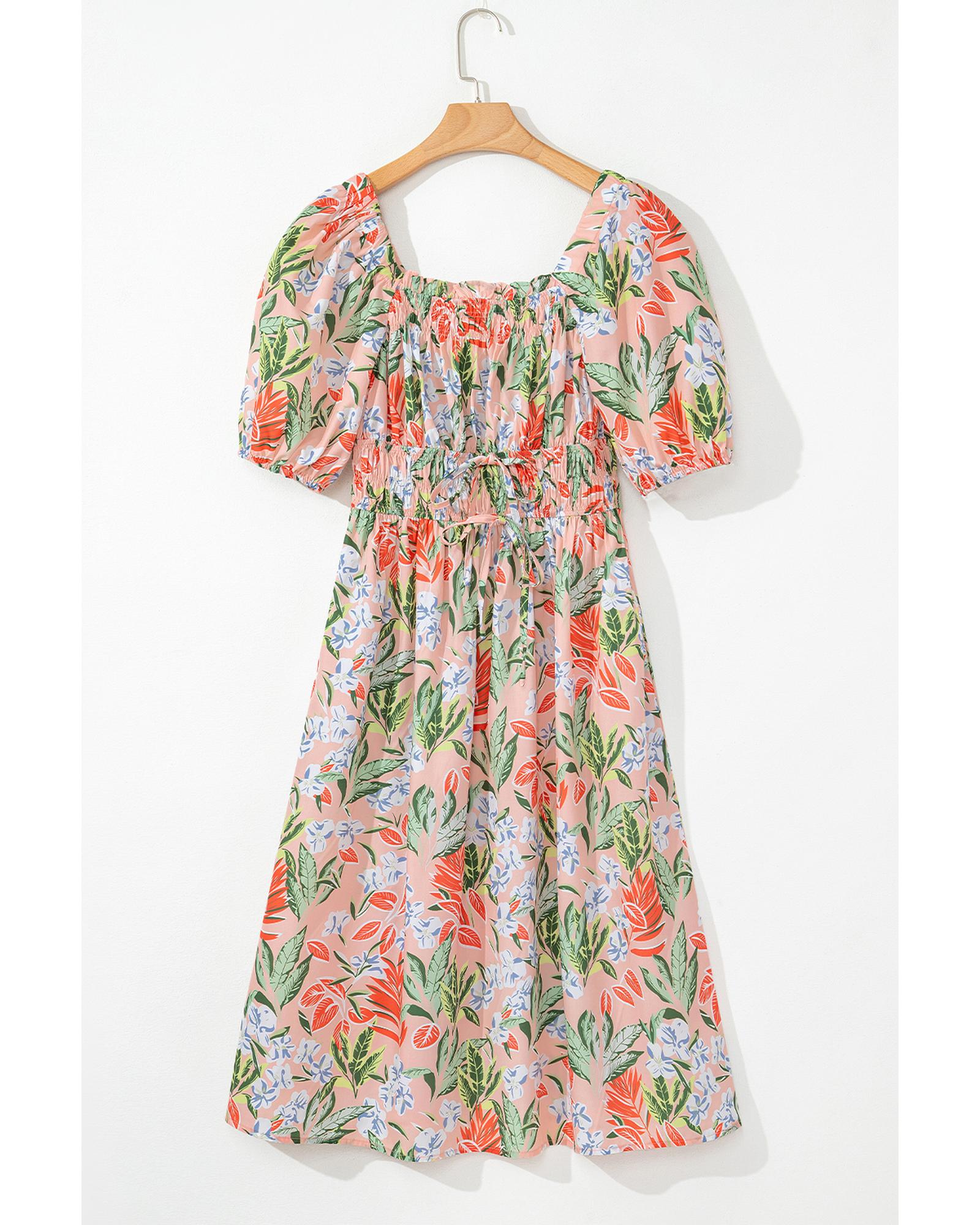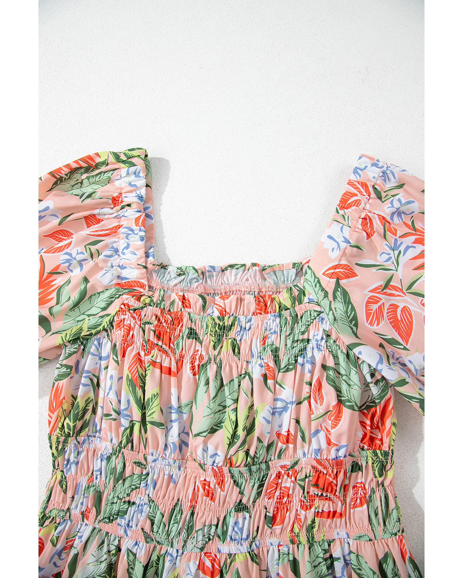 • Apricot Pink Floral Smocked Bust Bubble Short Sleeve Maxi Dress