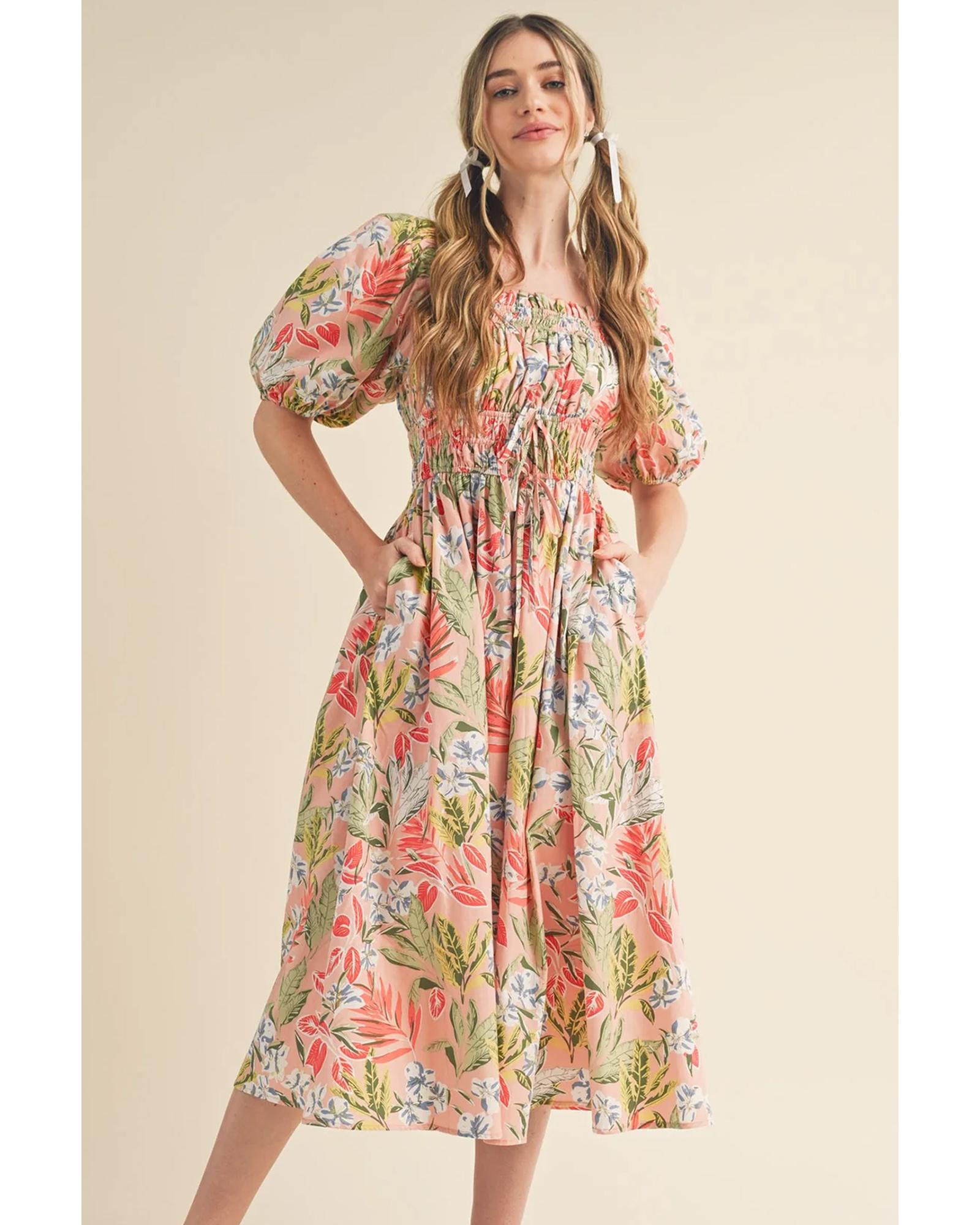 - Apricot Pink Floral Smocked Bust Bubble Short Sleeve Maxi Dress
