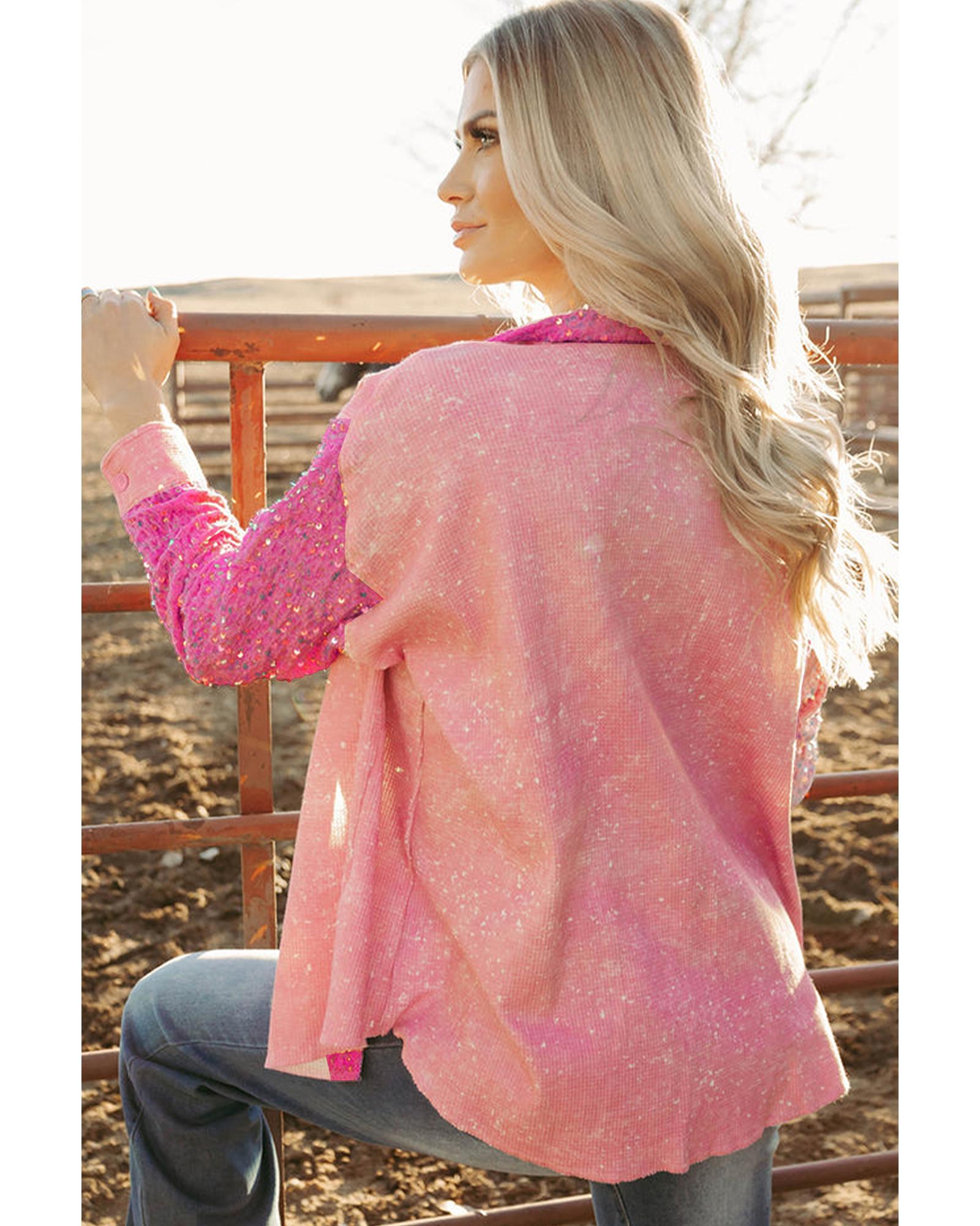 Apricot Pink Mineral Wash Sequin Patchwork Flap Pocket Shacket – L