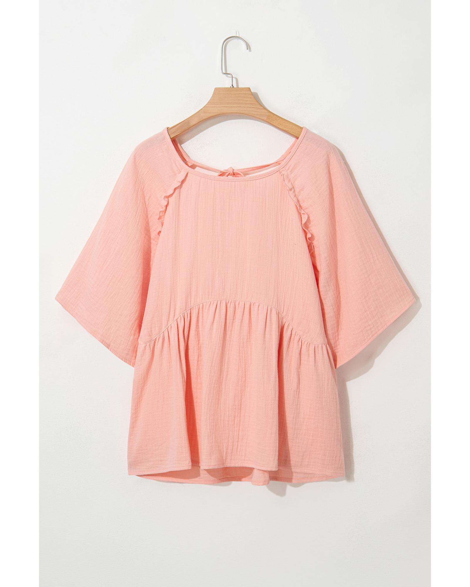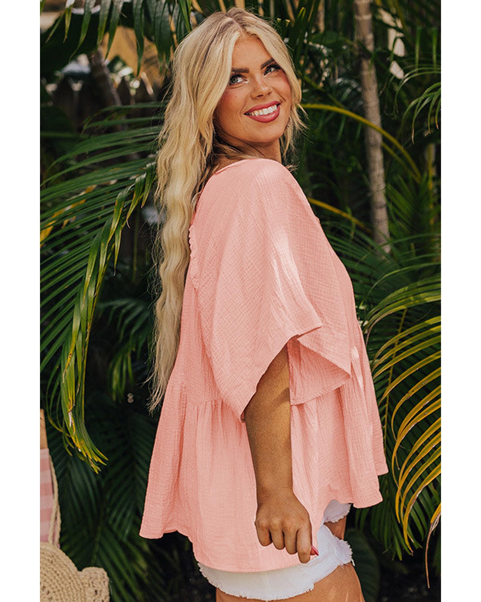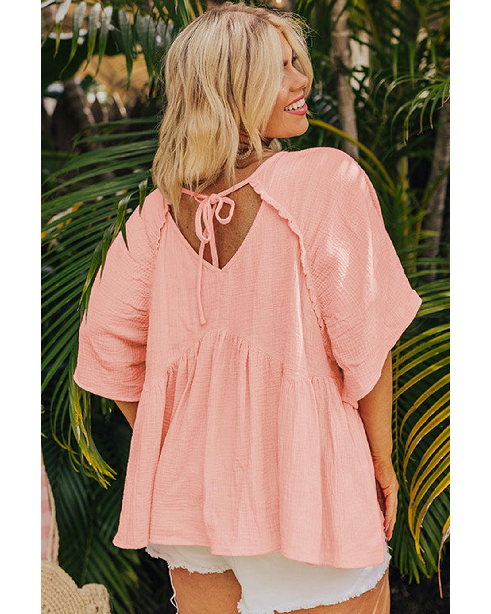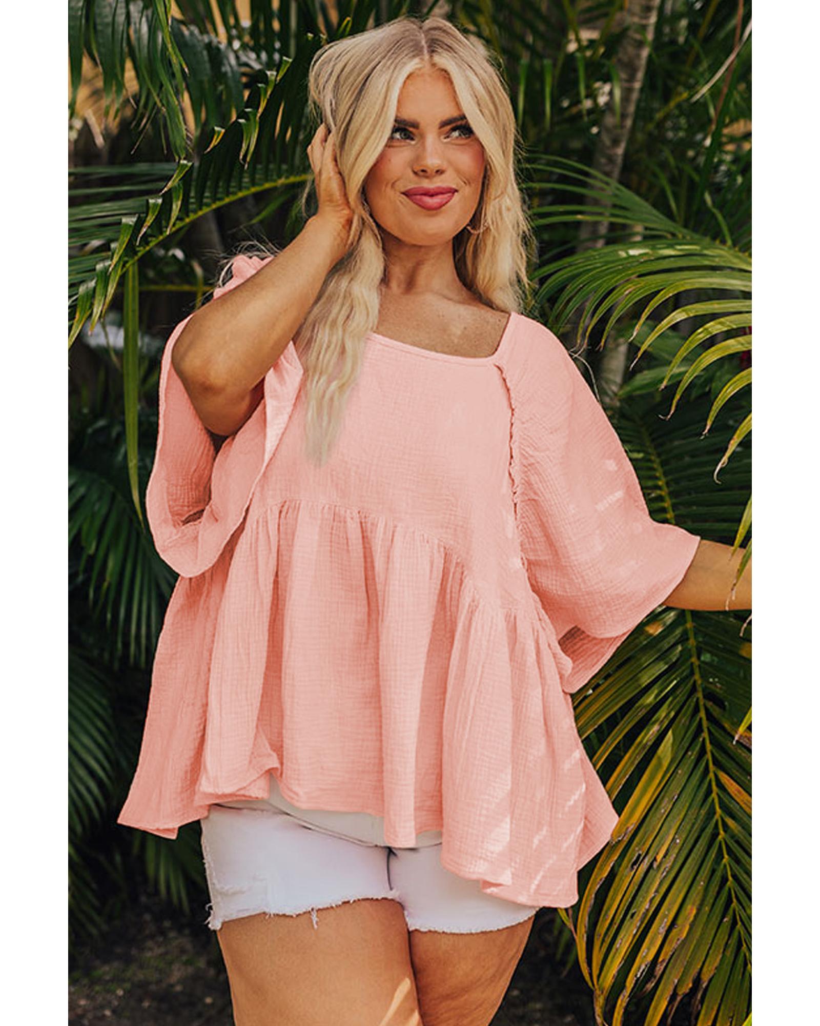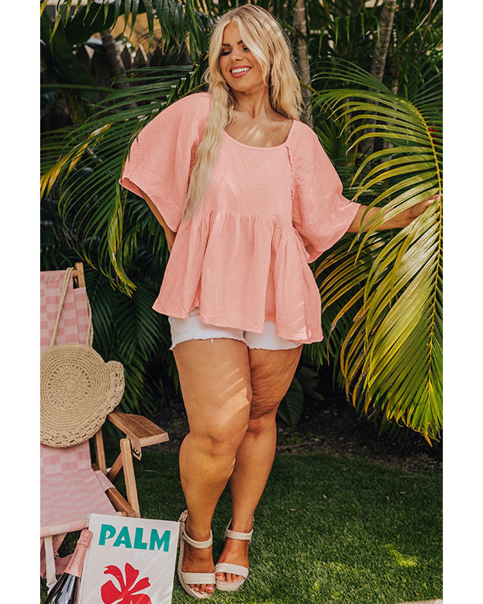 - Apricot Pink Plus Size Textured Wide Short Sleeve Babydoll Blouse