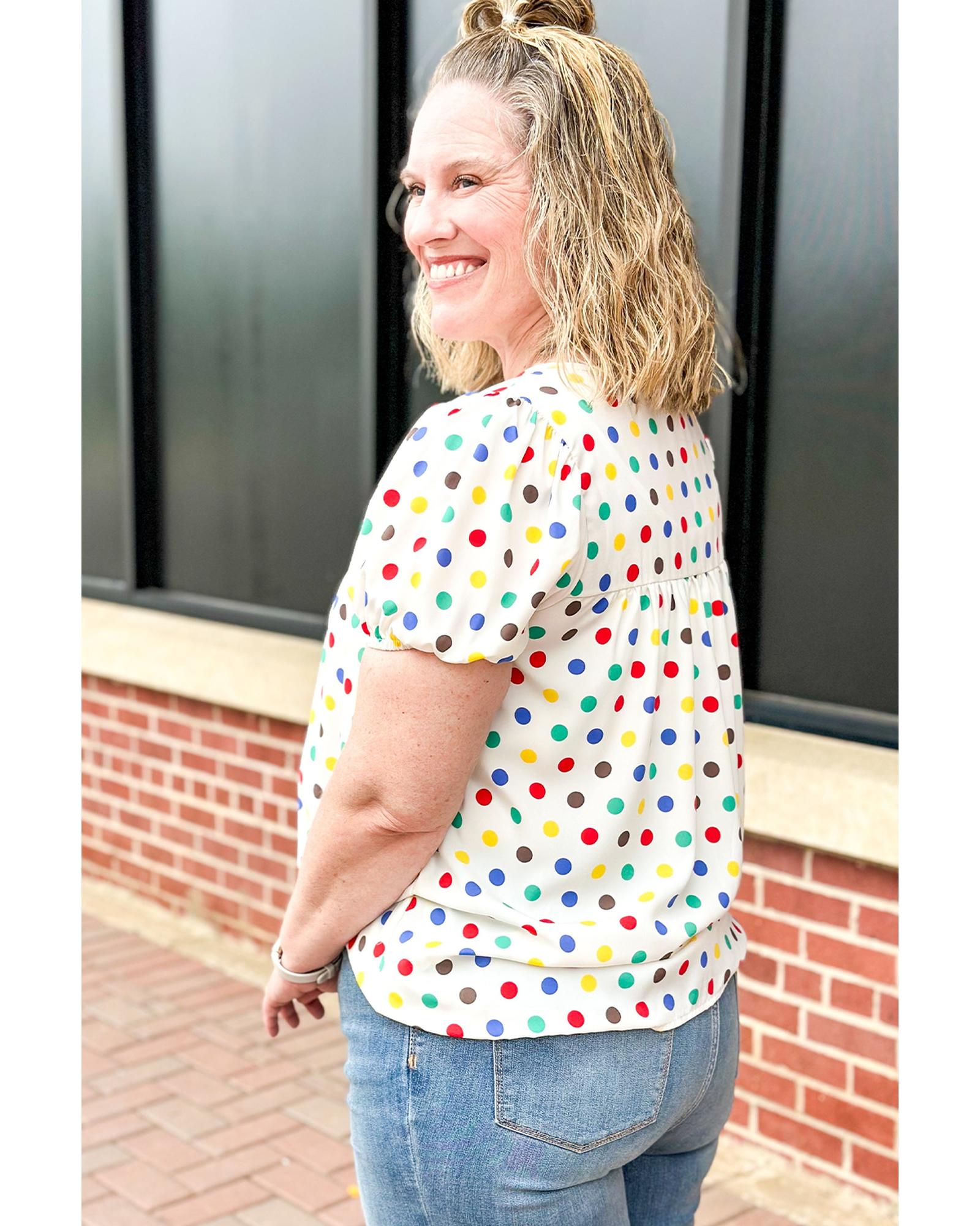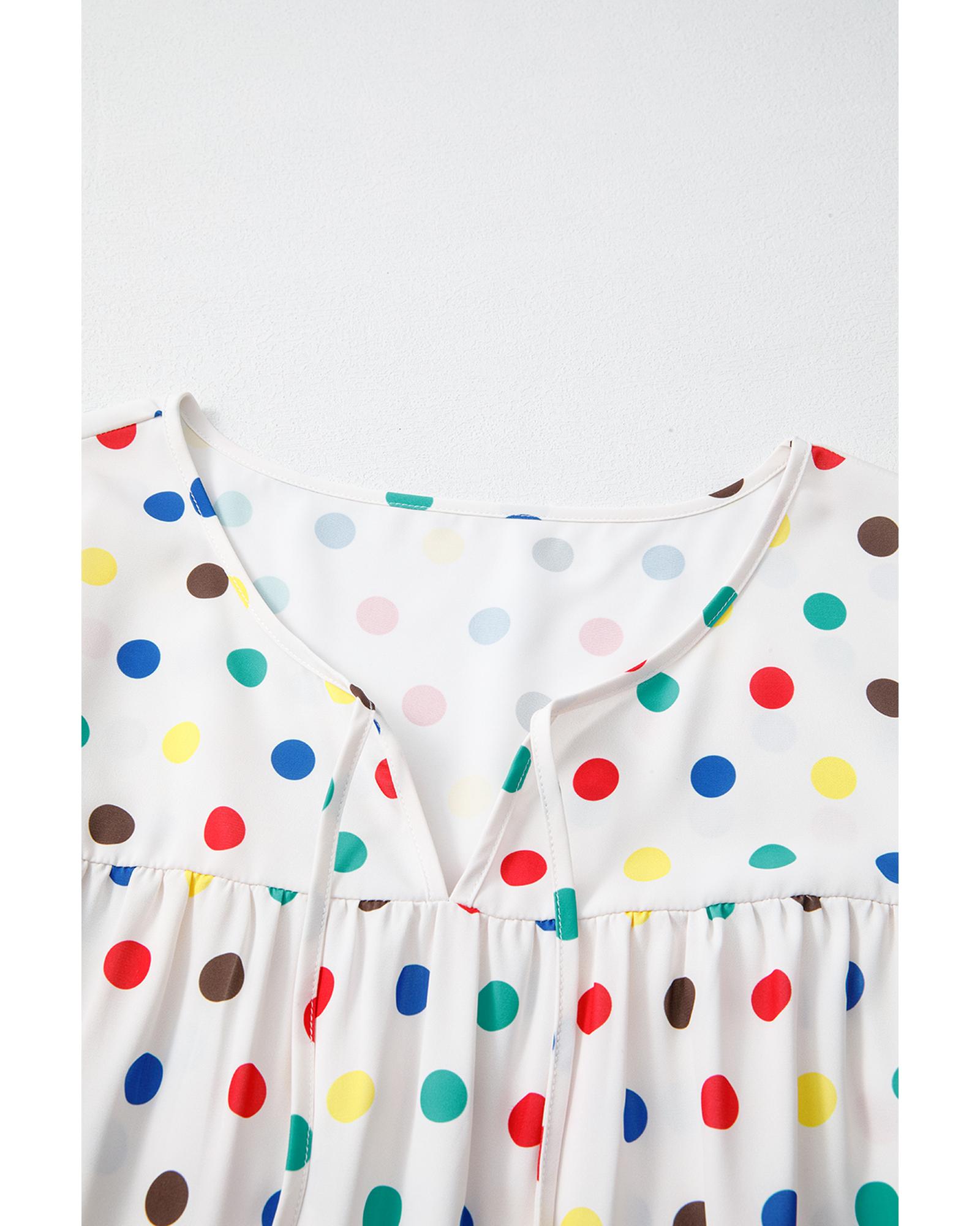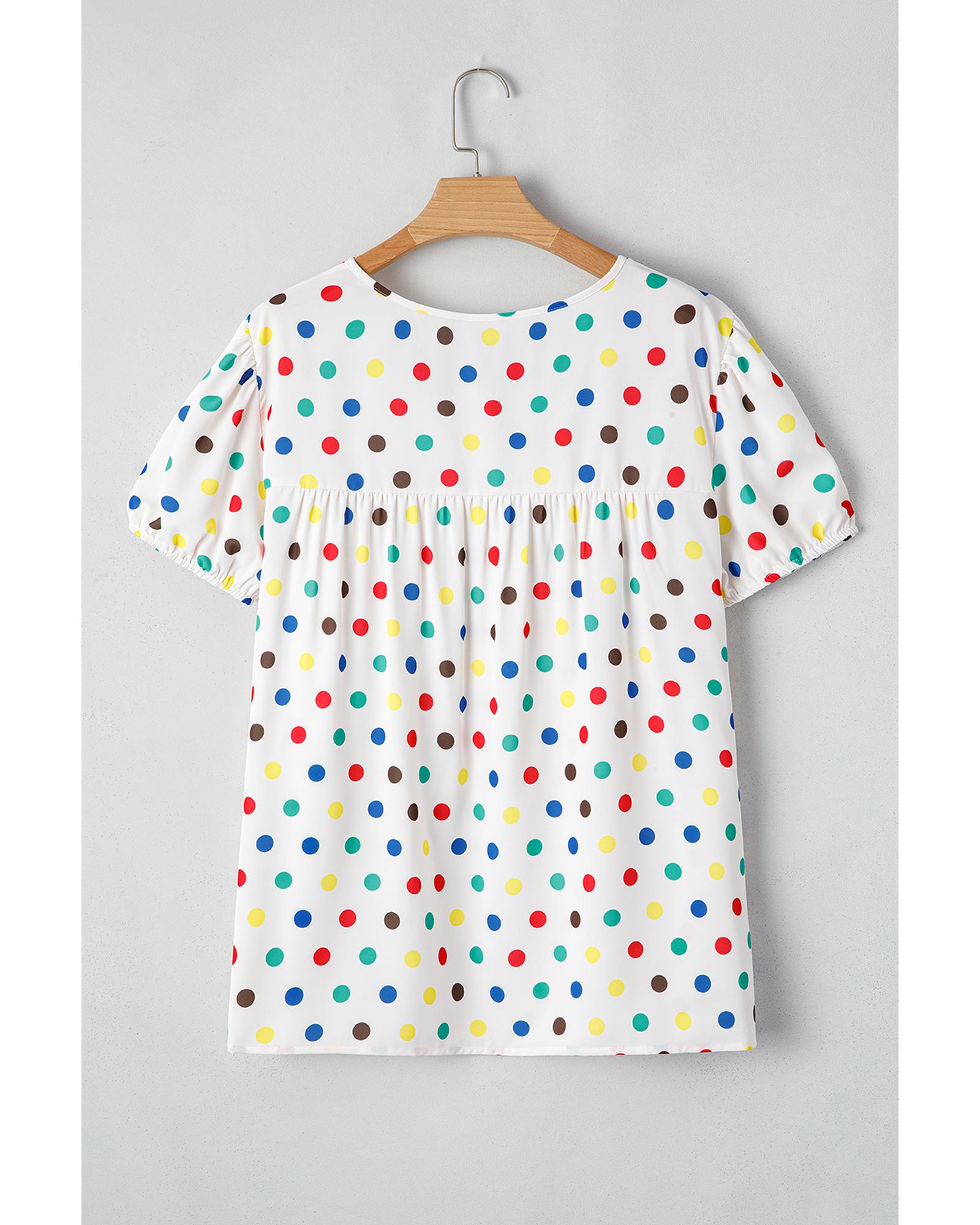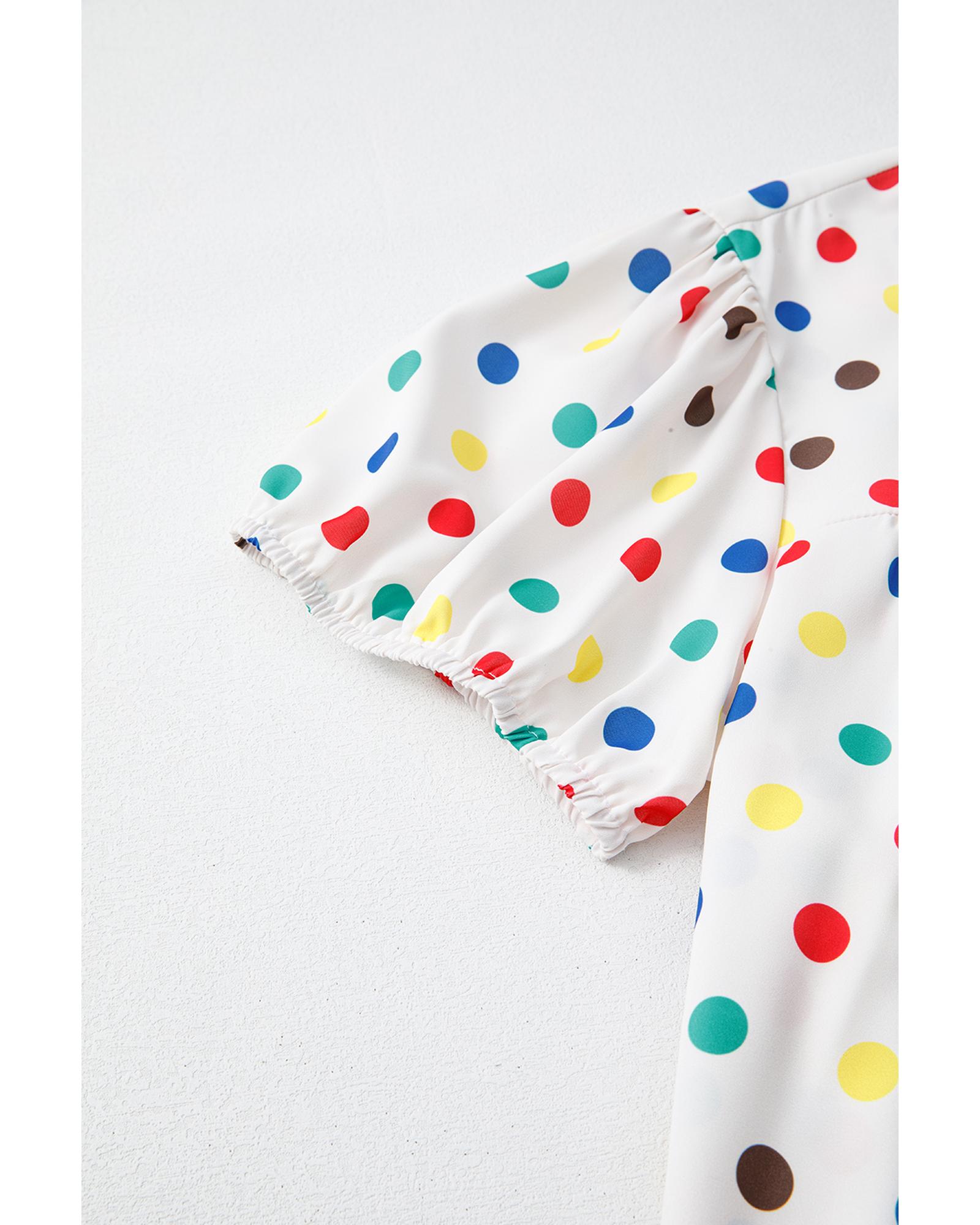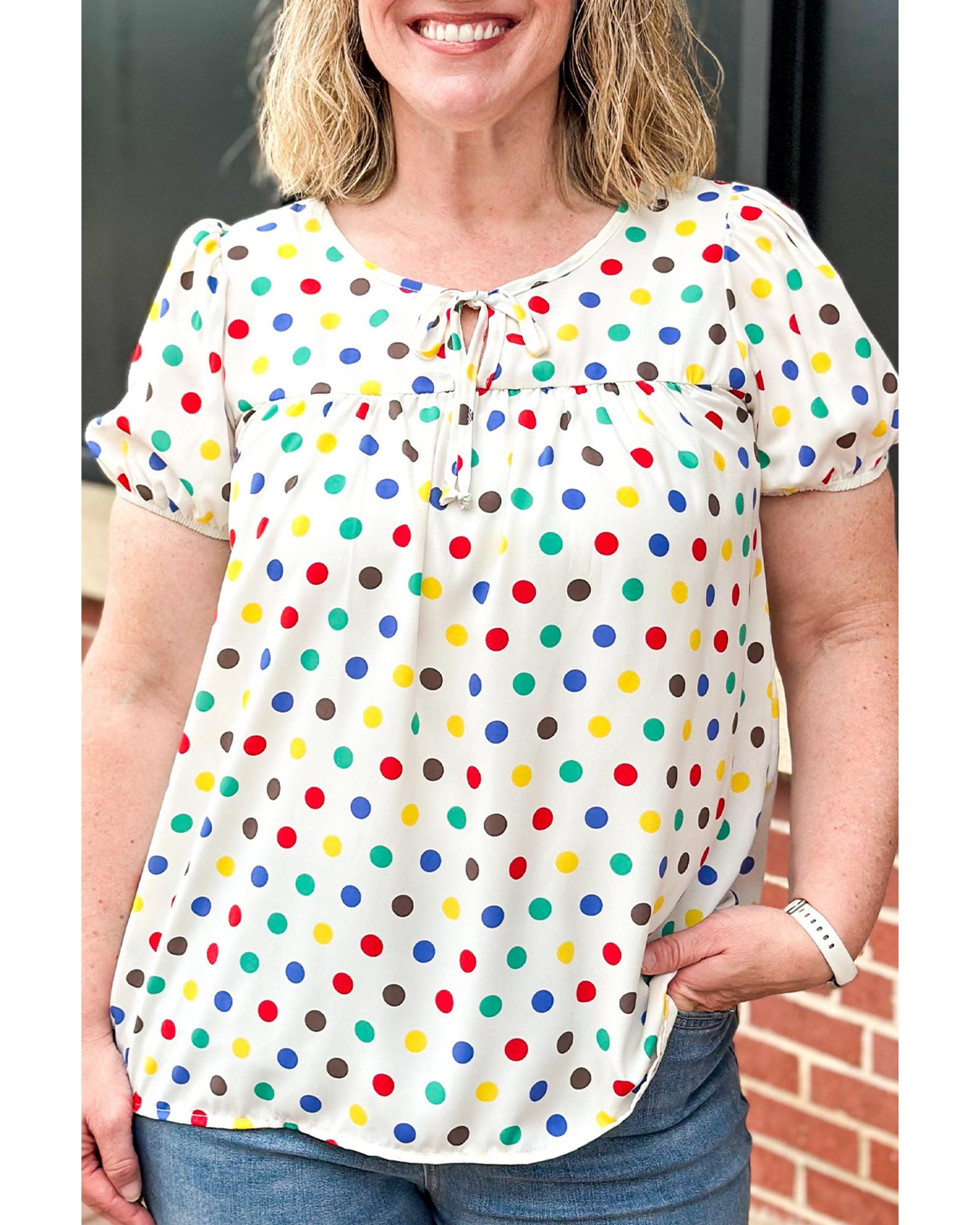Apricot Plus Size Colorful Polka Dots Tie Neck Puff Sleeve Blouse – 3X