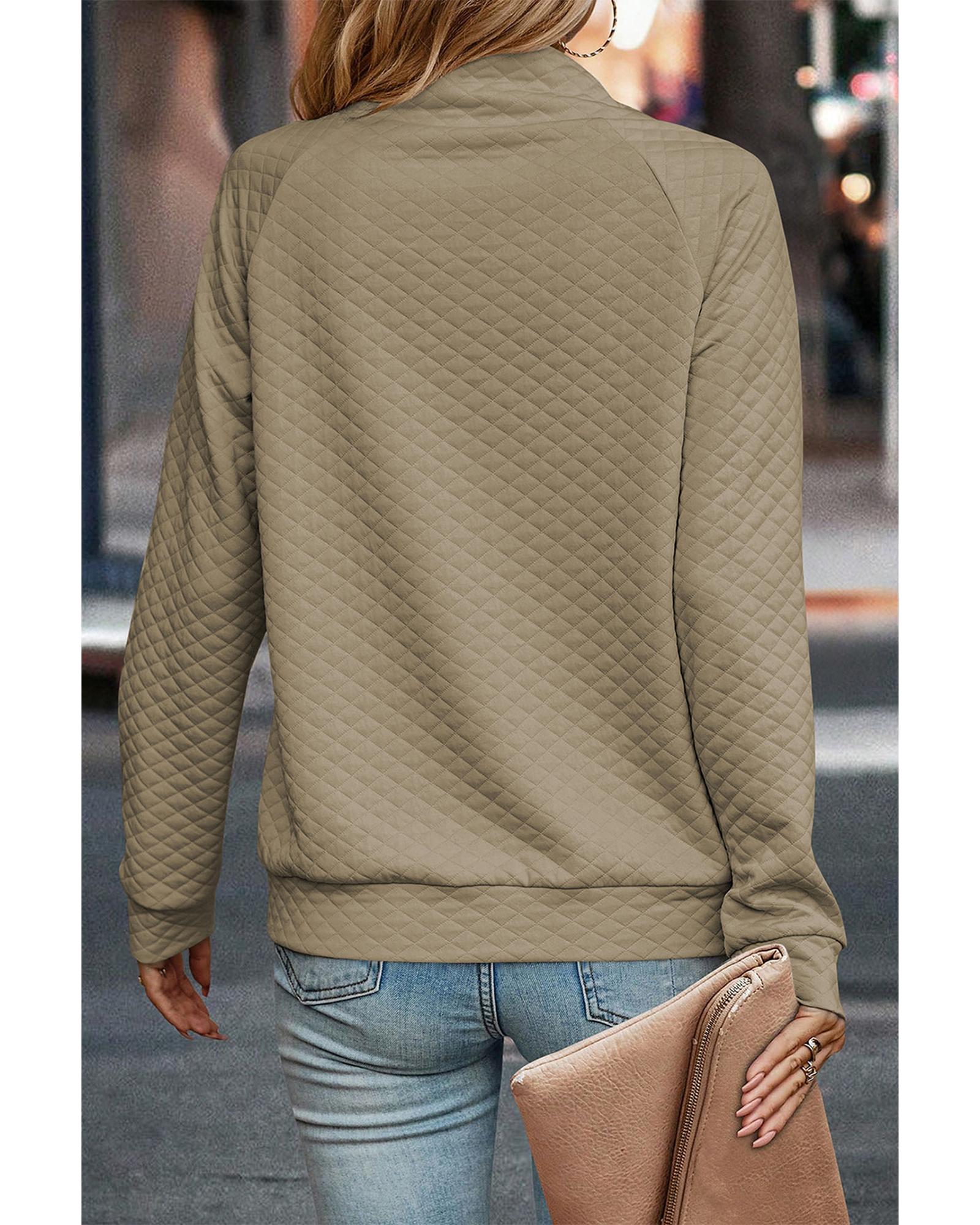 - Apricot Quilted Buttoned Neckline Stand Neck Pullover Sweatshirt