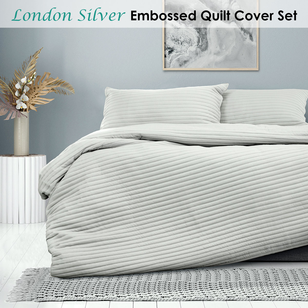 This London Silver Embossed Quilt Cover Set by Ardor is a perfect addition to your interior style. The soft embossed detail and muted hues will add elegance and detail to your bedroom. Style with plain colours or contrasting textures to instantly refresh your home style. It is made from lightweight and luxurious Microfiber fabric and Polyester fill with softness you can enjoy all night long and long lasting quality.