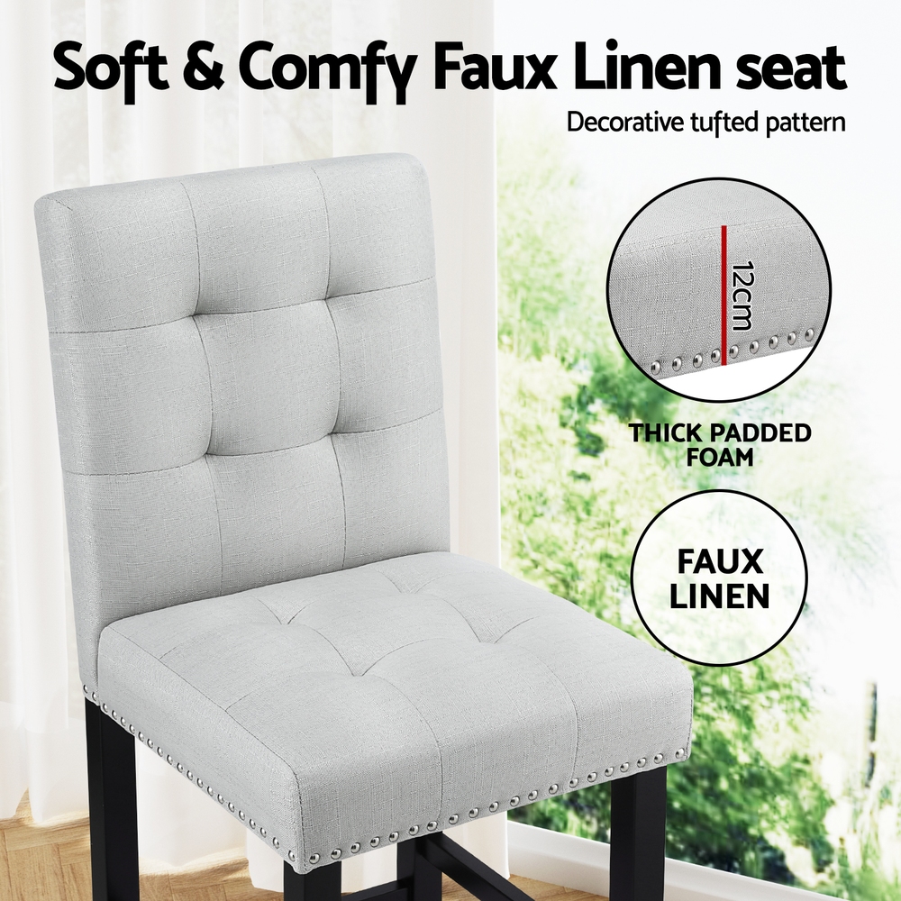 Upgrade your seating with our ergonomic tufted bar stools, perfect for home kitchens, bars, or dining spaces. Each stool boasts a premium faux linen upholstered seat, a decorative silver rivet edge, and a supportive high backrest for unmatched comfort. The thick foam padding ensures a plush seating experience, while the sturdy rubber wood frame delivers reliable strength with a 120kg weight capacity per stool. Anti-slip floor protectors keep your floors scratch-free, and the easy assembly design saves you time. Add elegance and comfort to your space today!