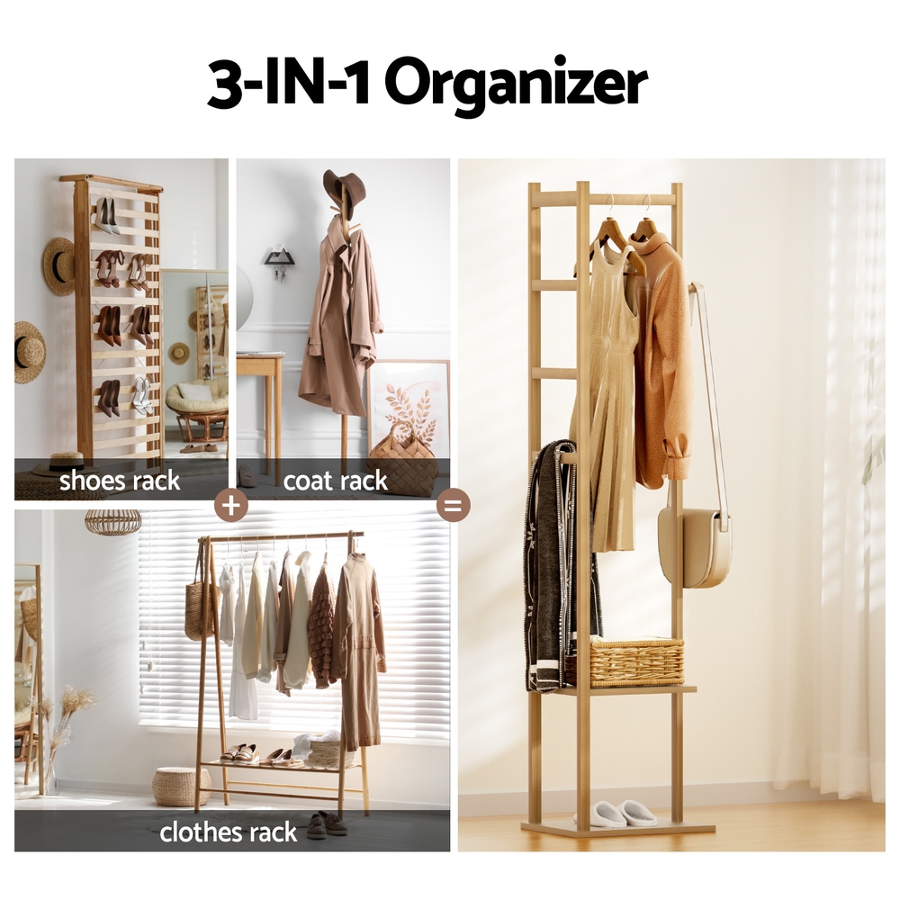The Artiss Bamboo Clothes Rack is a stylish and practical solution for your home organisation needs. Featuring a sturdy bamboo construction with metal fixings, this 3-in-1 rack includes a hanging rail, side hook, and storage shelf for ultimate convenience. Its lightweight, portable design makes it perfect for any room, while the smooth, polished surface ensures easy cleaning. Whether for clothes, hats, or shoes, this coat stand offers functionality and elegance, making it an ideal addition to modern spaces.