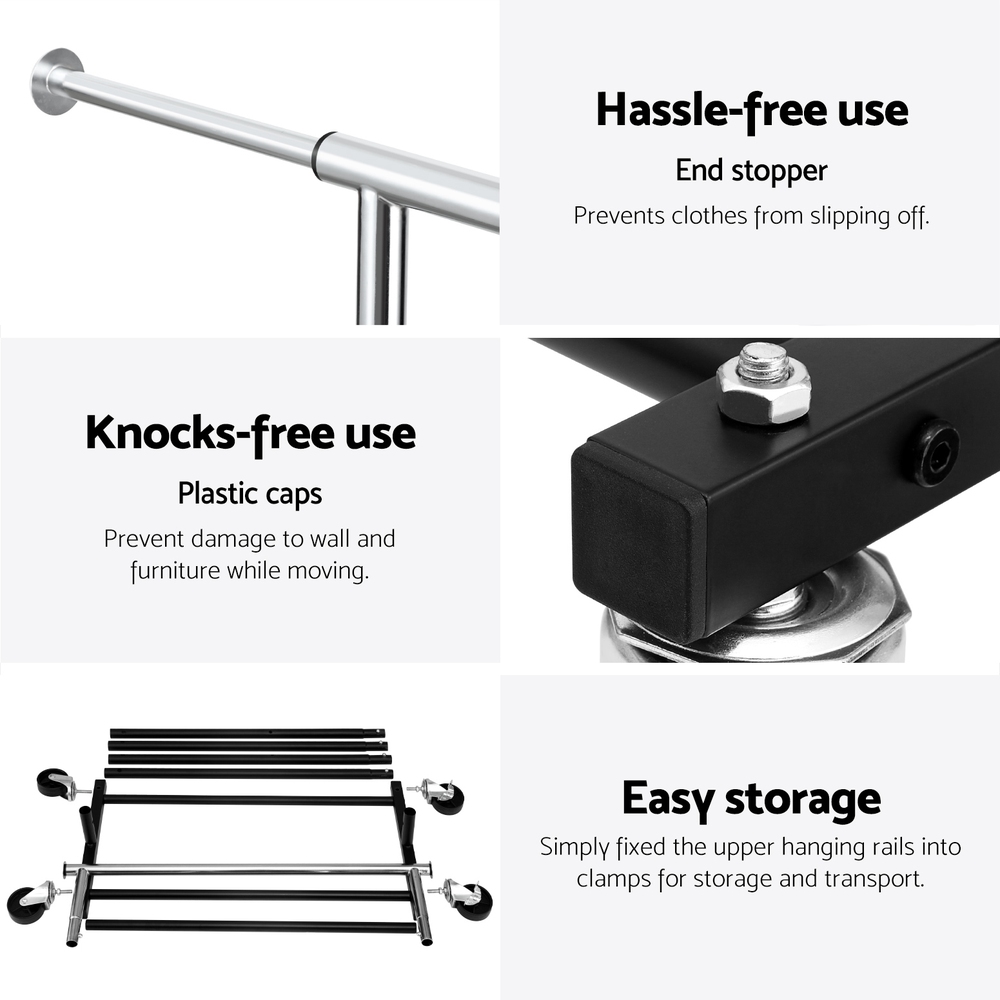 Organise outfits effortlessly with Artiss heavy-duty clothes rack, combining industrial strength with smart design. The corrosion-resistant metal frame ensures long-lasting support for coats, dresses, or other items. Glide smoothly across floors with 360° swivel casters – two lockable wheels keep the rack stationary when needed. Adjust the horizontal rod length to accommodate different clothing sizes, while protective plastic caps shield walls from scratches. Collapse the rack vertically for under-bed or cupboard storage. Perfect for rental spaces, retail displays, or daily home use!