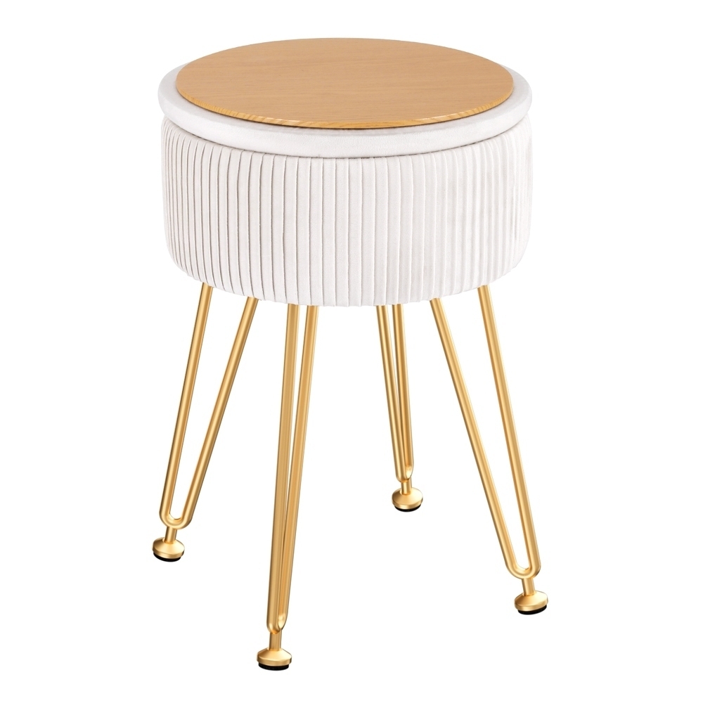 This round velvet Artiss footstool features a reversible table lid, vertical stripe design, durable MDF frame, high-resilience foam padding, and adjustable metal legs with floor protectors. Use it as a footstool, coffee table, and storage. Simple assembly required.