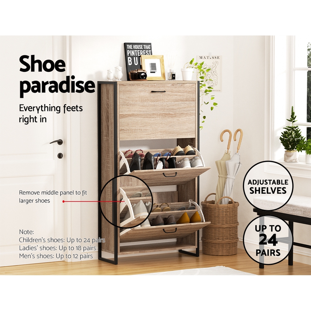 You are shoe proud. That is why you need ample space for all that wonderful footwear. Organise and save your floor space with our Artiss Shoe Cabinet and have a clutter-free entrance at all times. The three storage compartments are pull-down for easy access and have adjustable shelves so that they can fit different footwear of all shapes and sizes. In fact, up to 24 of your favourite pairs would fit comfortably in it. Solidly constructed with metal side frames, thick particle board and smooth paper veneer finish, the shoe cabinet is strong and durable to withstand daily robust use. Not least, the eclectic industrial design with beautiful black vintage-style handles definitely lends a touch of elegance to any home.