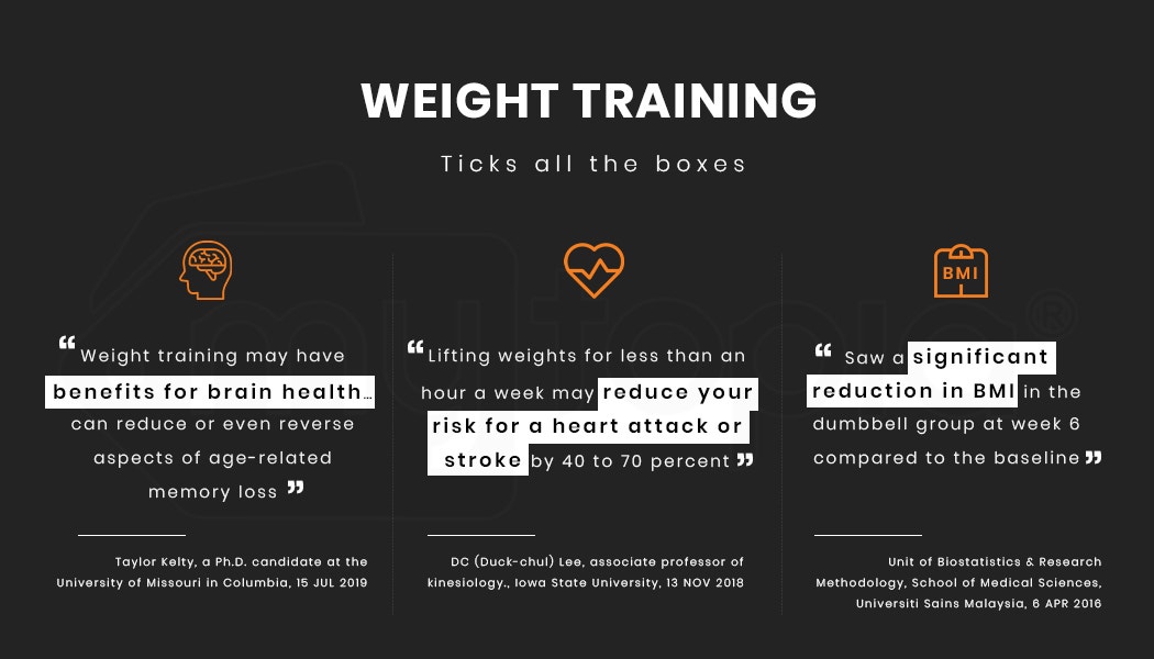 Ask any serious bodybuilder; free weights are hands-down the best tools for increasing your strength and muscle mass. They open up a huge range of exercises and, as opposed to machines, engage a lot of additional muscle groups to keep the balance