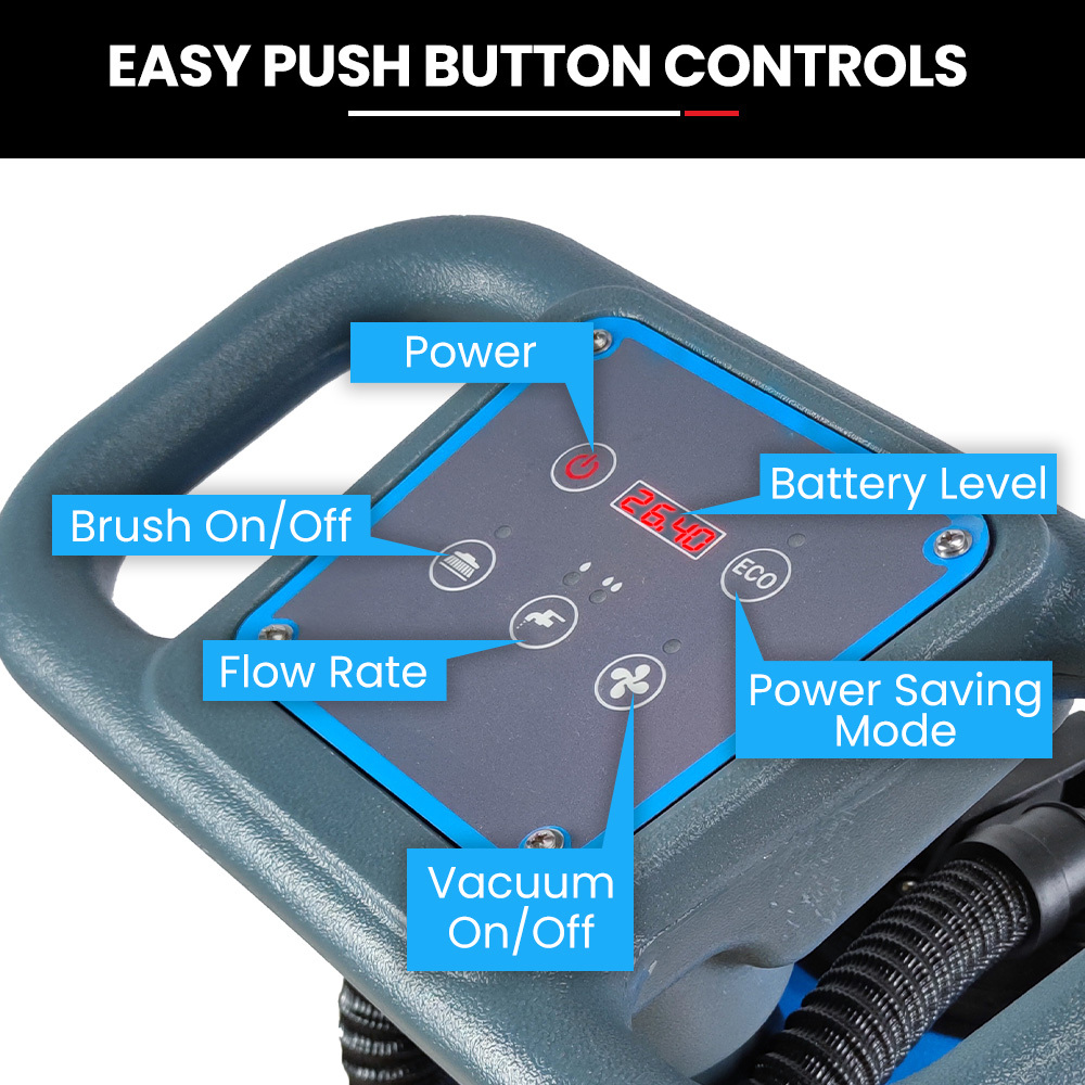 Maintain extensive areas without interruptions with a 13L solution tank and a 15L recovery tank, each equipped with easy-to-use covers for hassle-free maintenance. The dual-handle design with safety locks and accessible switch controls enhances user comfort and safety, making it ideal for prolonged use in commercial settings.