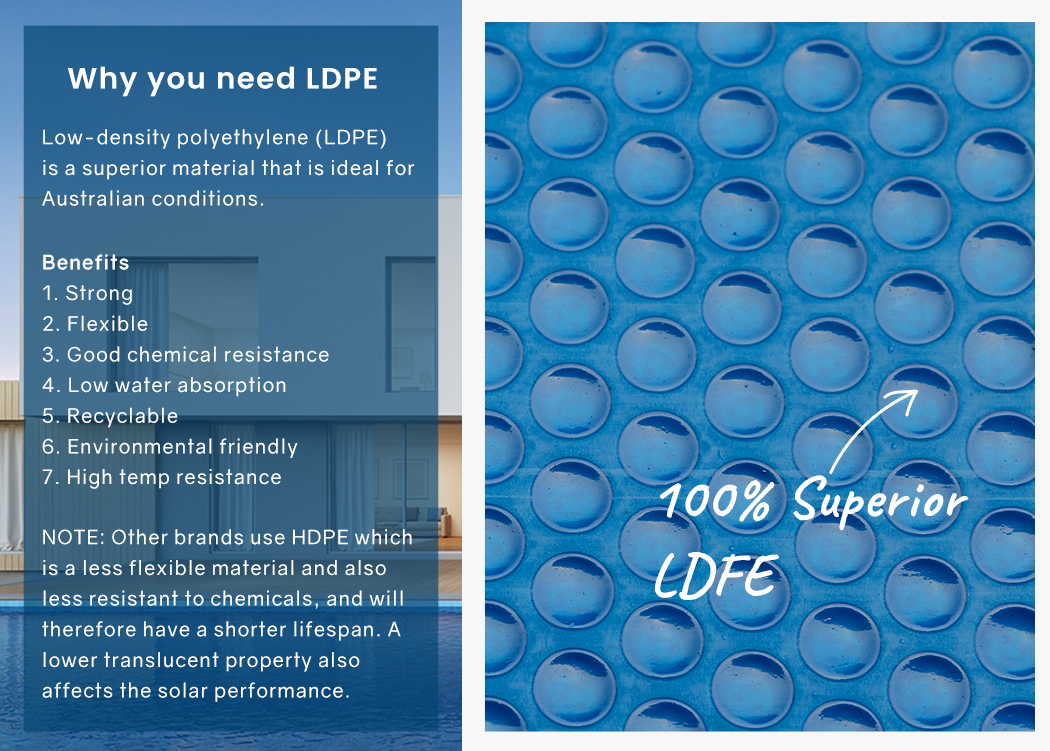 Low-density polyethylene(LDPE) is a superior material as it is tough and flexible and can withstand high temperatures which makes it necessary for Australian conditions. Other brands use HDPE which is a less flexible material and also less resistant to chemicals, and will therefore have a shorter lifespan. A lower translucent property also affects the solar performance.