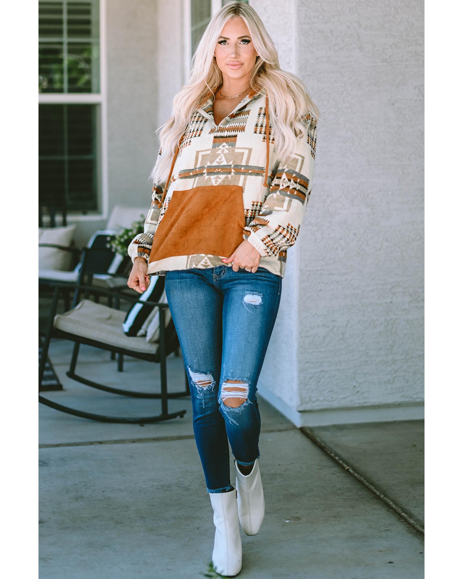 Azura Exchange Beige Aztec Print Half-Zip Hoodie with Kangaroo Pocket - S Original price was: $72.99.Current price is: $38.99.