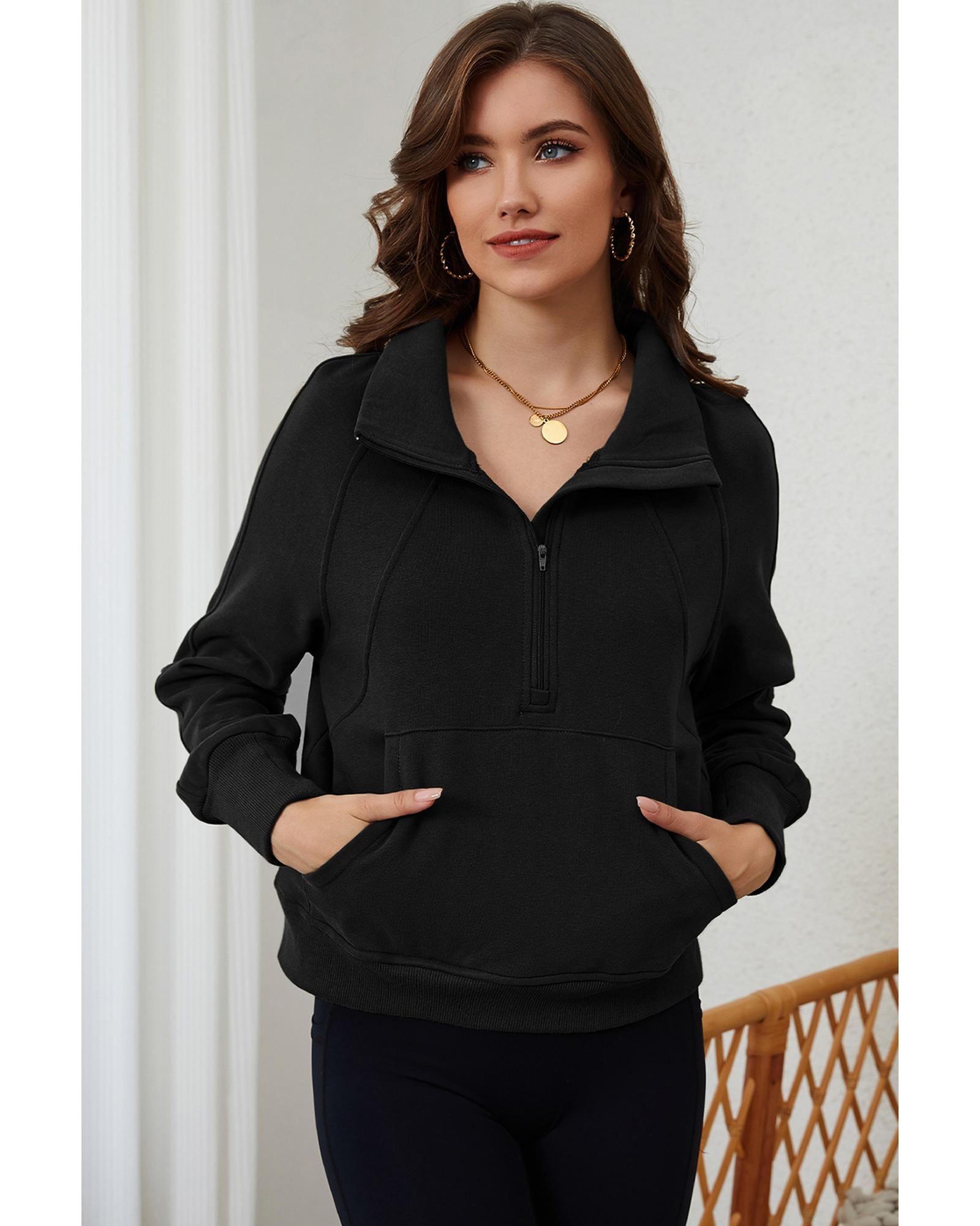 - Black Zip Up Stand Collar Ribbed Thumbhole Sleeve Sweatshirt