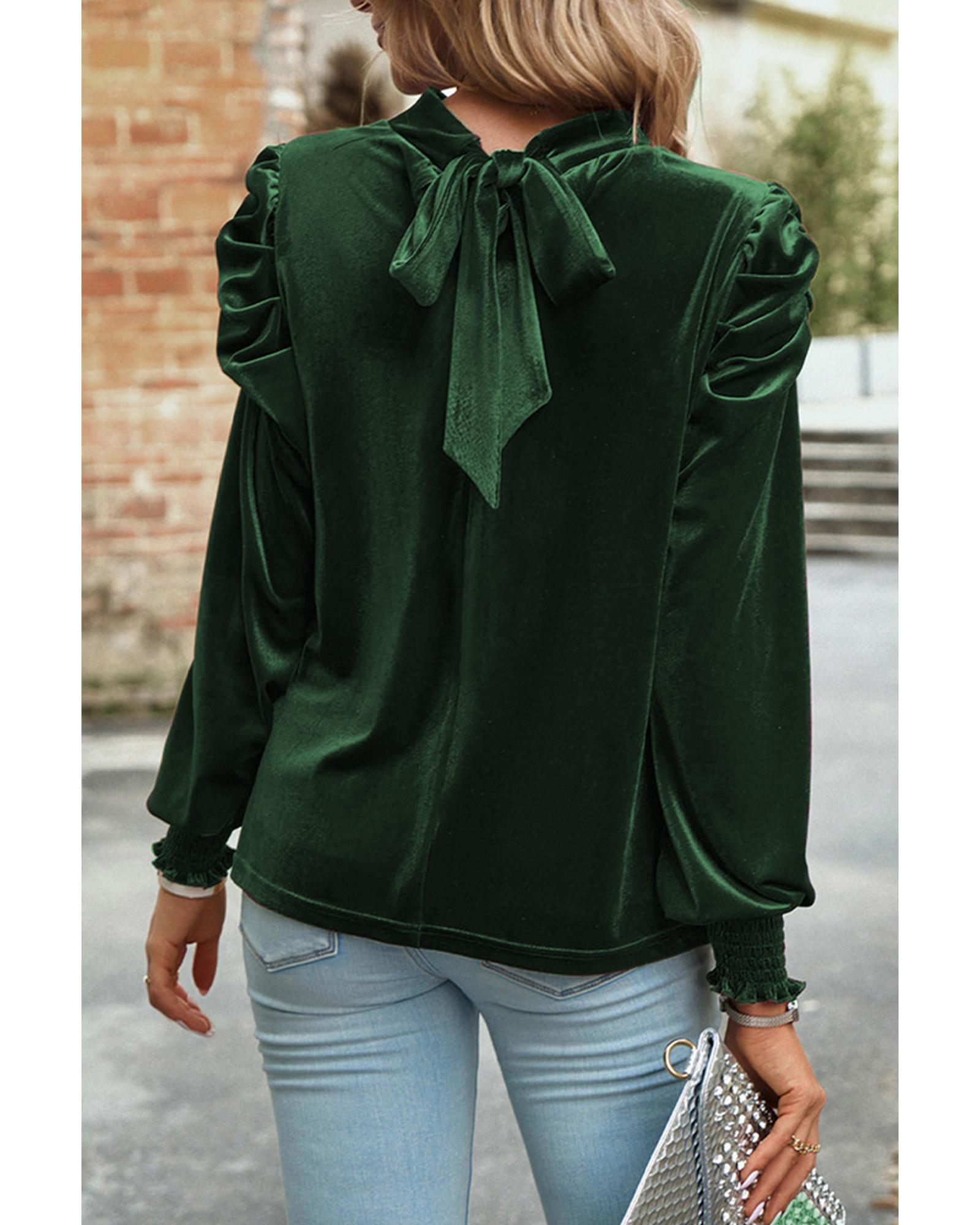 Azura Exchange Blackish Green Mock Neck Puff Sleeve Velvet Blouse – S