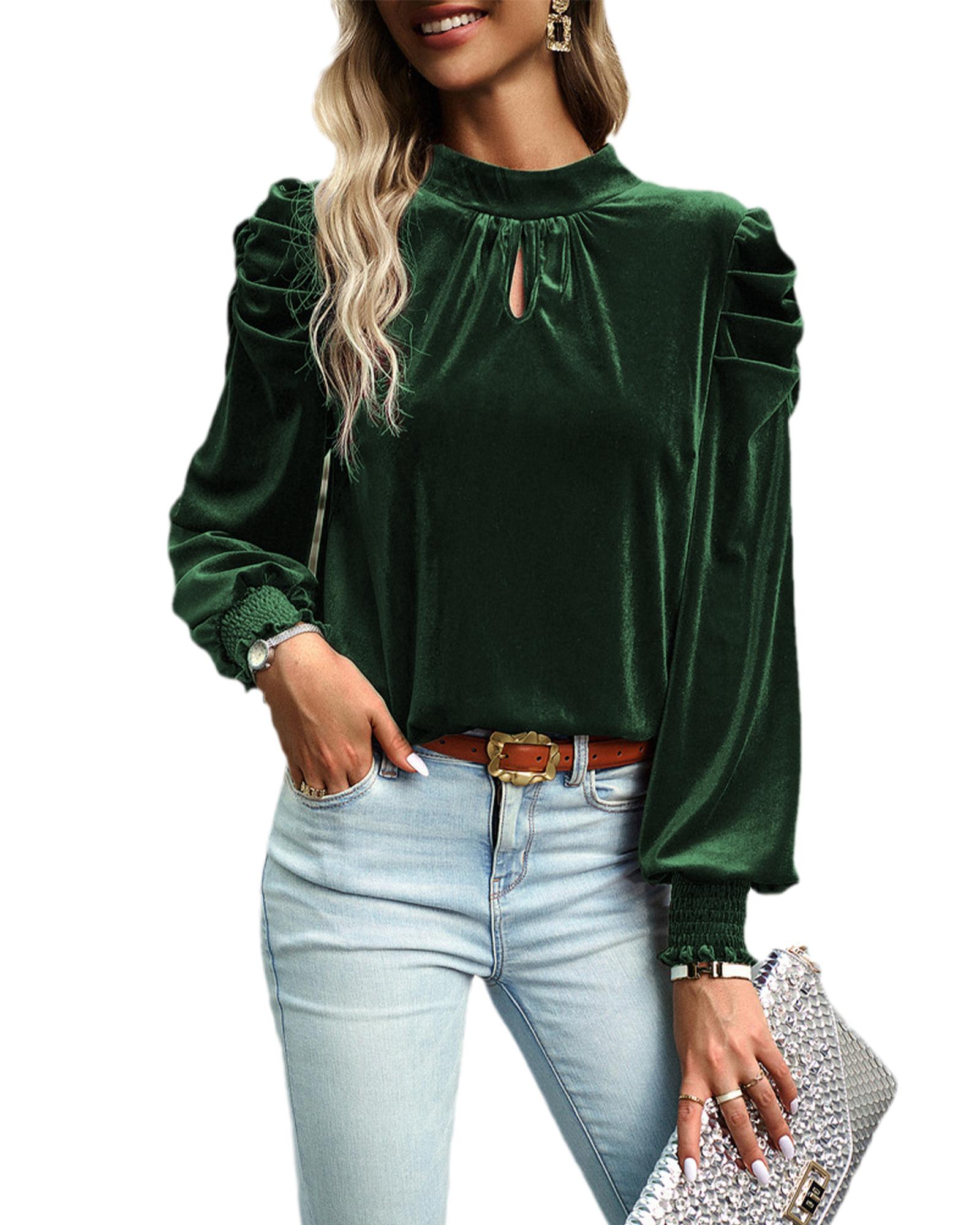 Azura Exchange Blackish Green Mock Neck Puff Sleeve Velvet Blouse – XL
