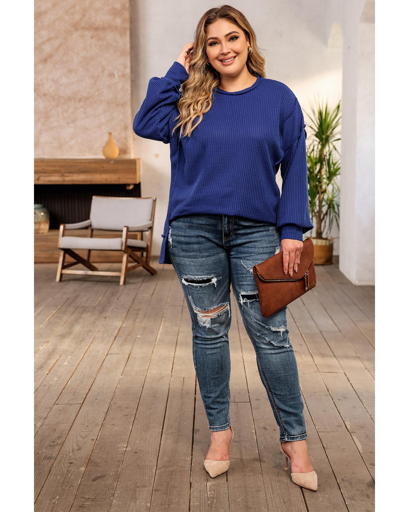 - Blue Plus Size Waffle Knit Oversized Exposed Seam Top