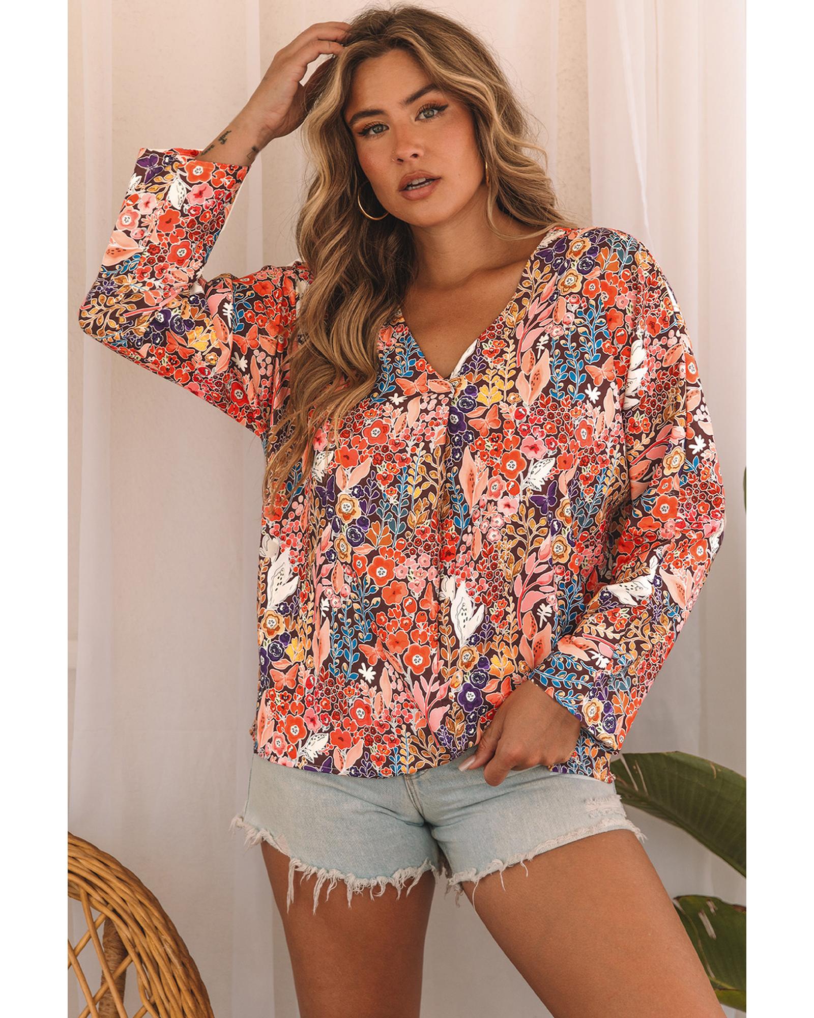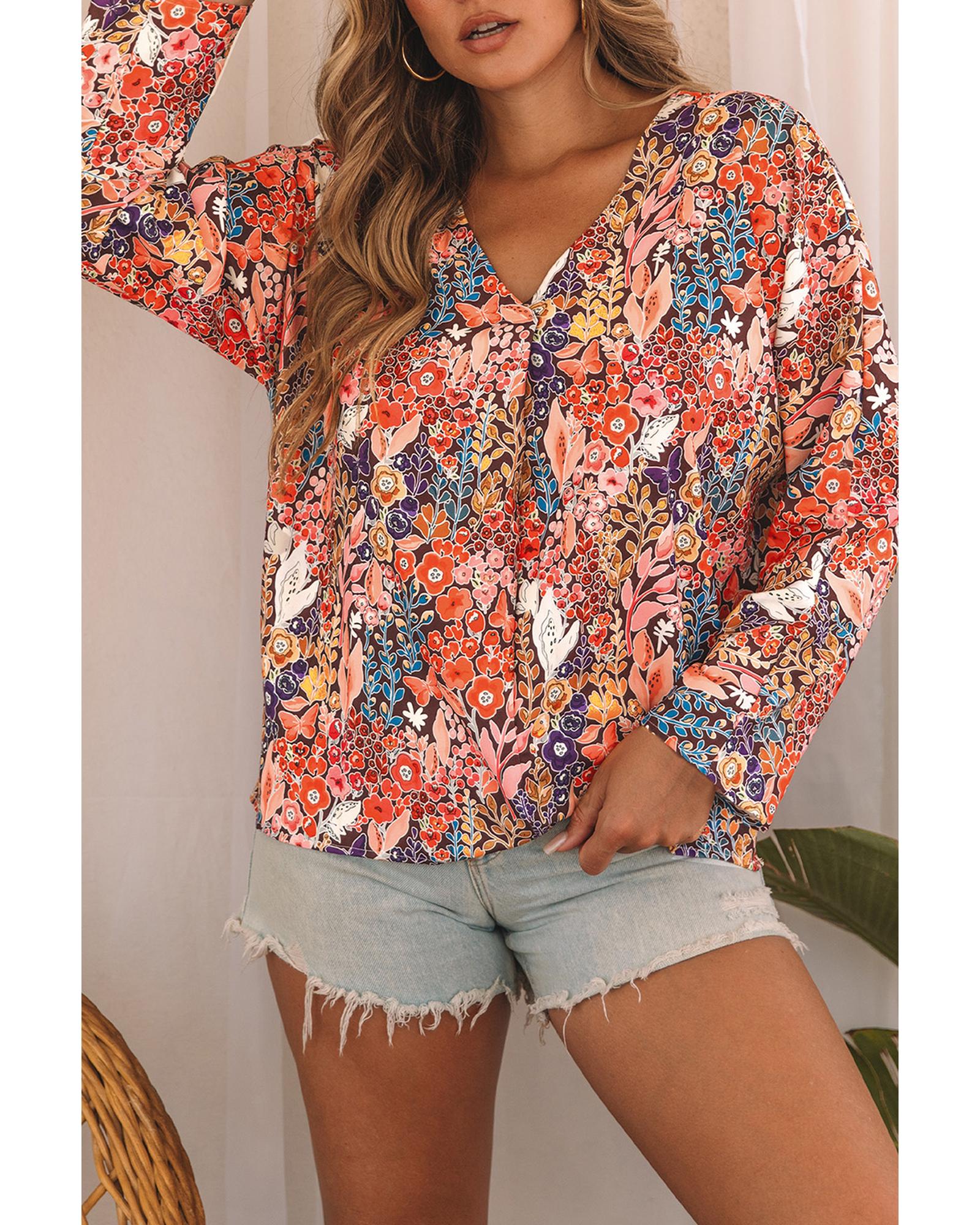 - Multicolor Boho Floral Long Sleeve V-Neck Blouse