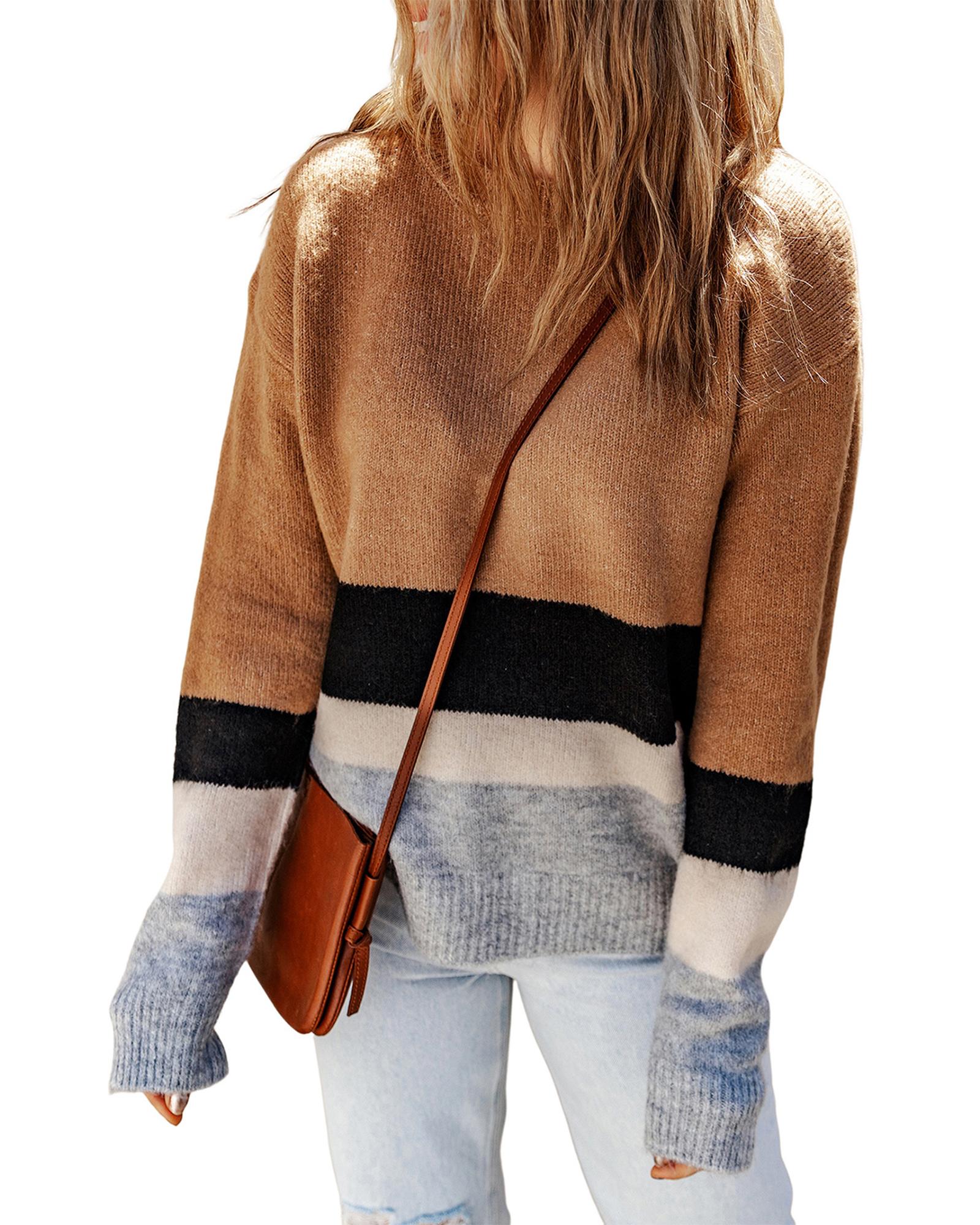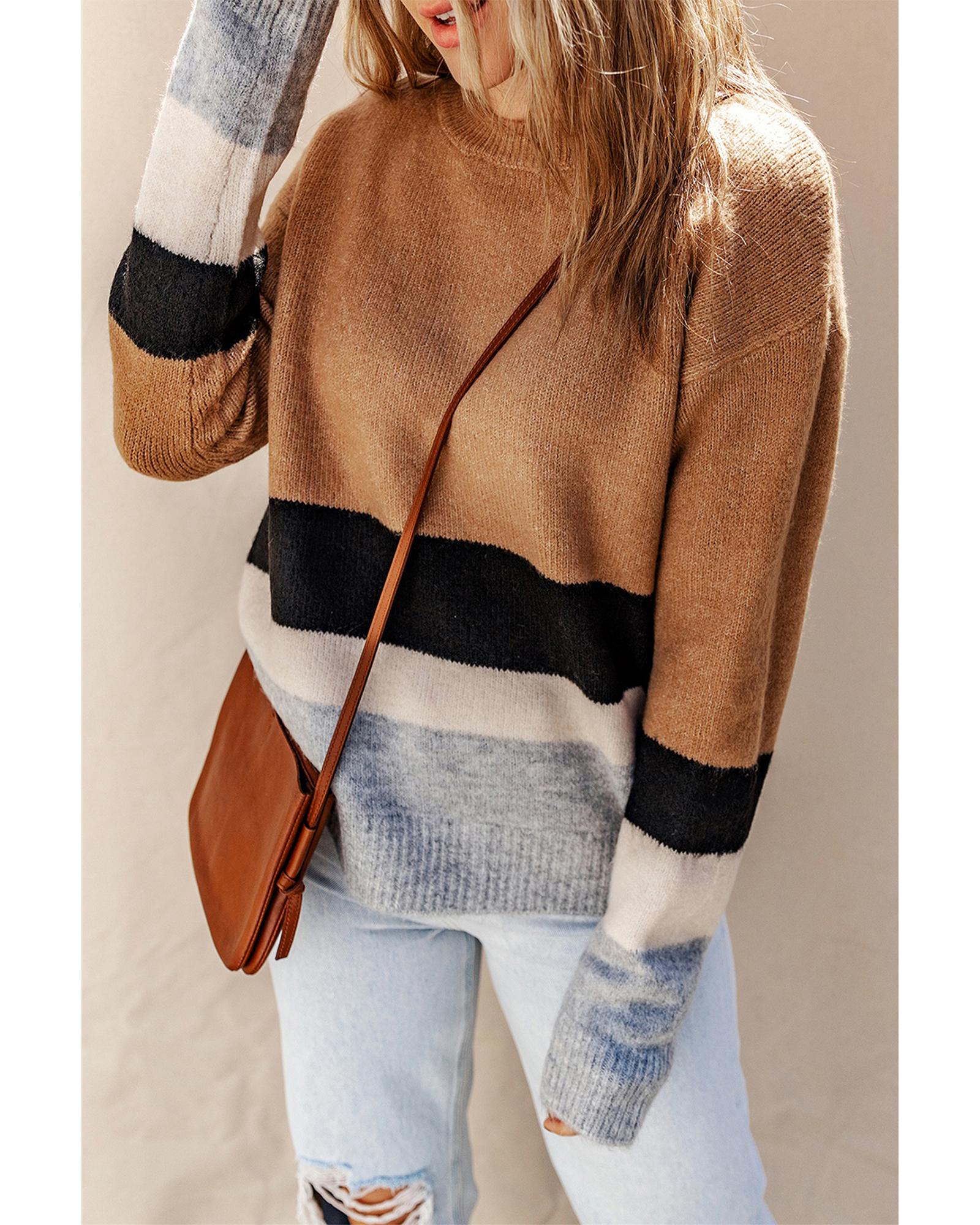 Azura Exchange Brown Color Block Striped Ribbed Knit Sweater – L